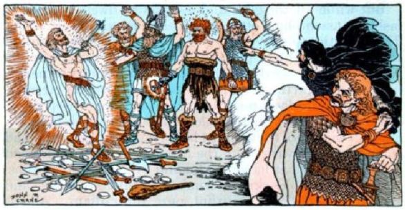 就这样,在众神的笑声中,这支矛向巴德尔飞了过去。众神们看着它飞过去,然后等着他像其它的武器一样转到一旁。然而当矛尖刺破了巴德尔的心脏的时候,他们无法相信的大叫起来,巴德尔就这样在众神的注视之中倒在了地上。