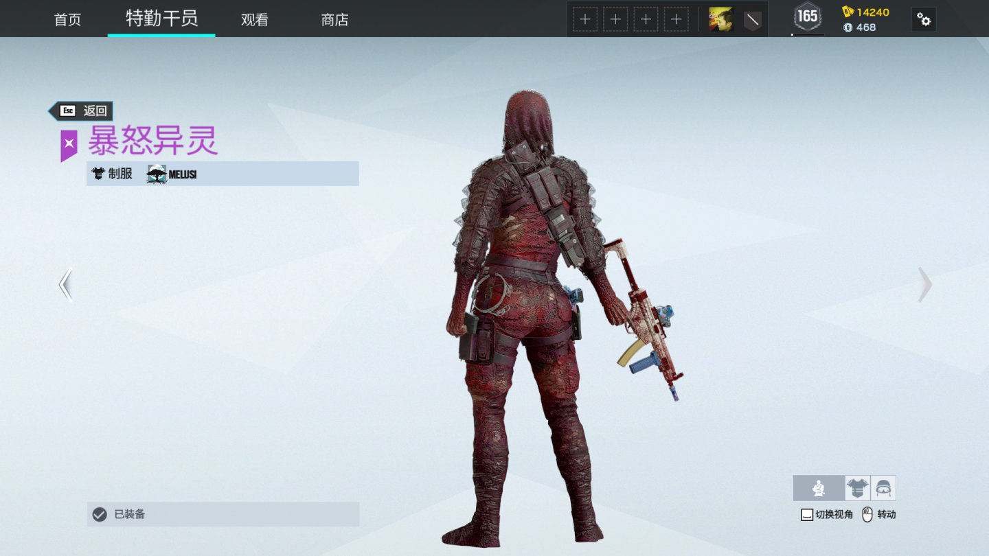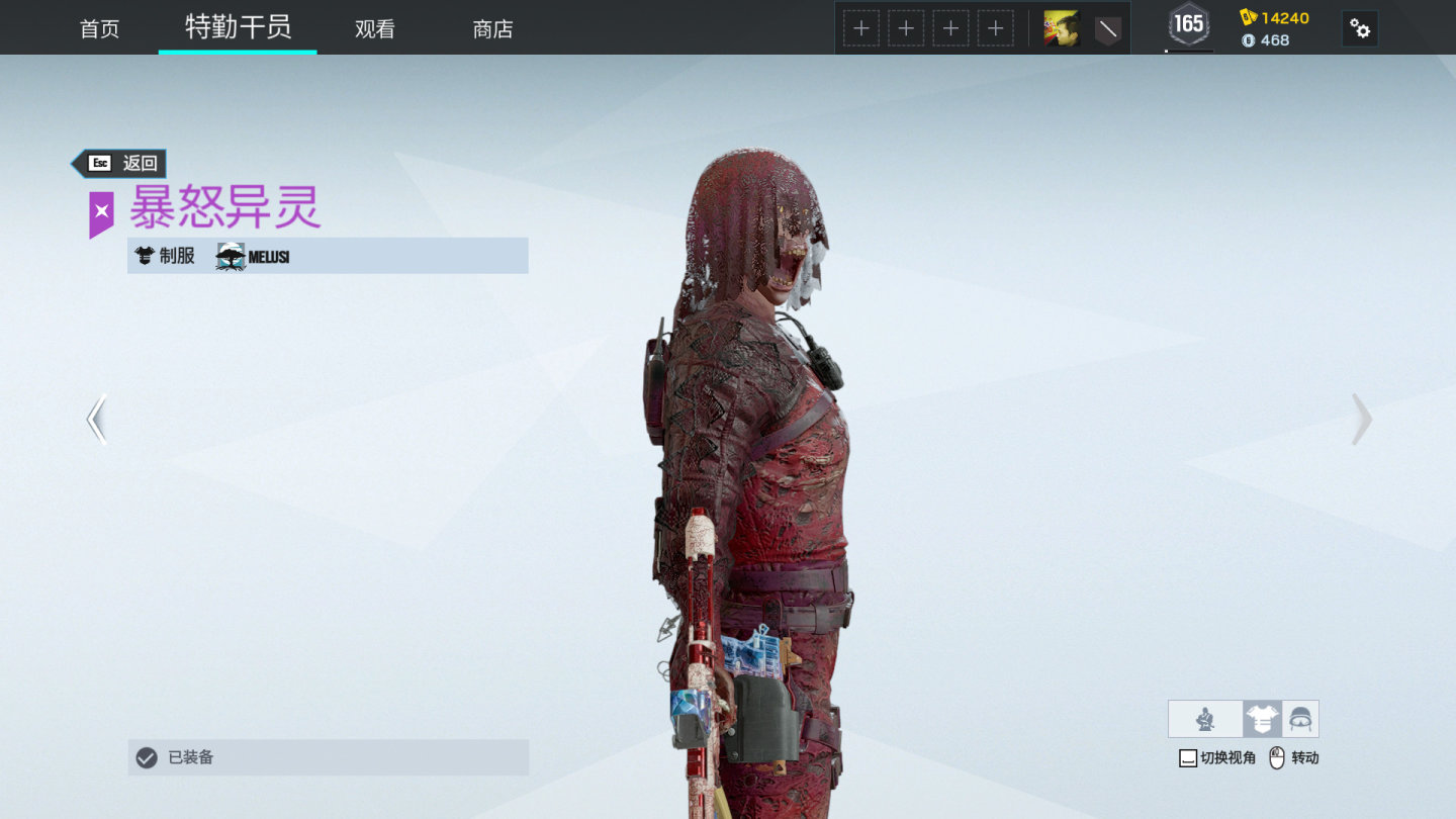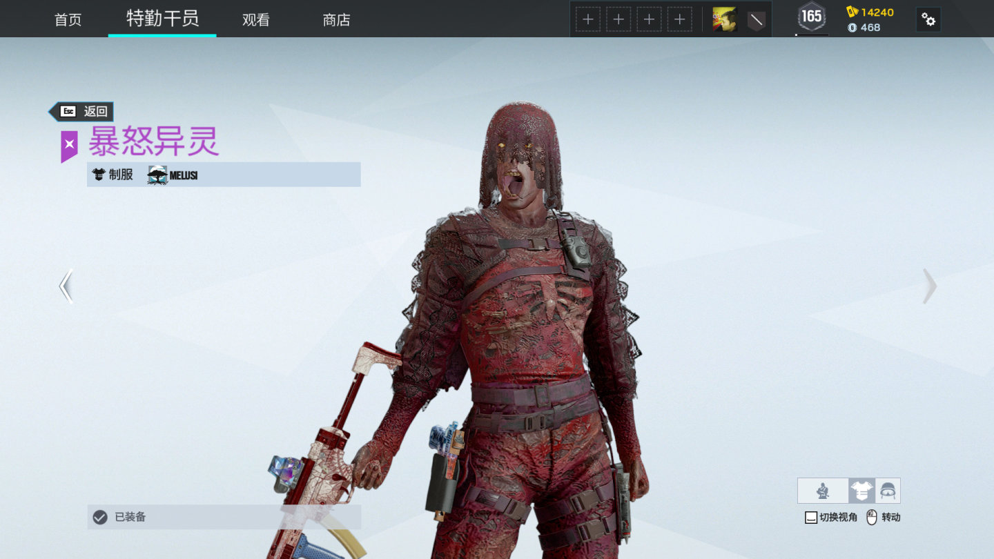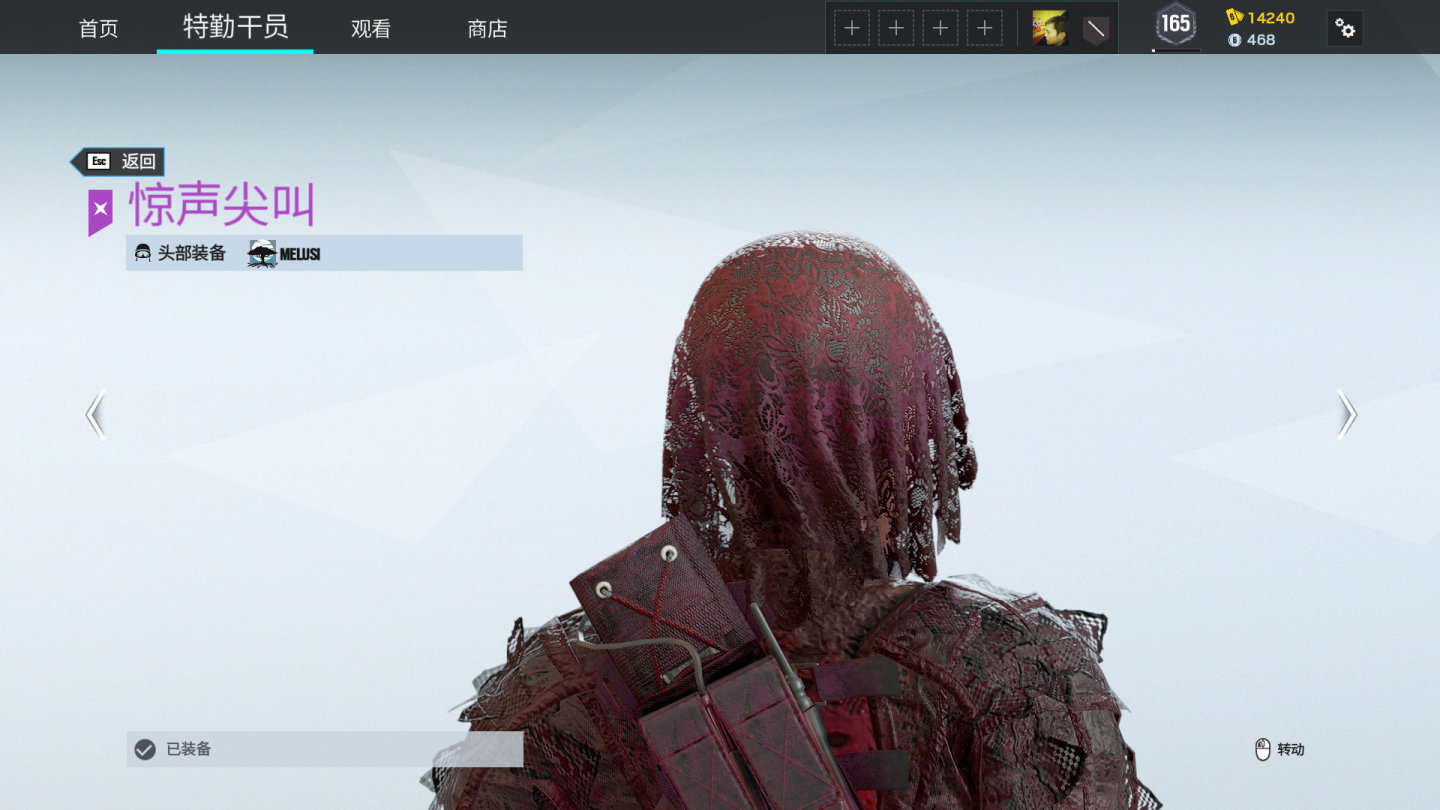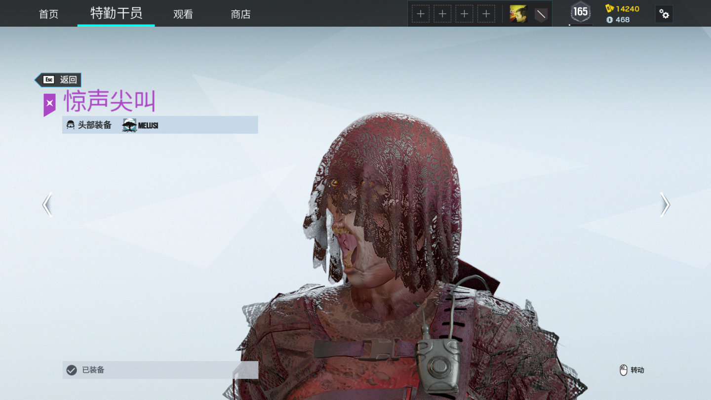 Melusi暴怒尖叫套装,泛黄的眼球已经变质,面部并非自主长大嘴巴,实际上是下颚已经断裂,仅靠皮肤悬挂于上颚,自然下垂哦~。干员在跑动后静止,脸部的下颚会随运动方向抖动(牛顿第一定律)。头上盖的破布,有镂空花纹装饰,能隐约看见melusi的头皮。