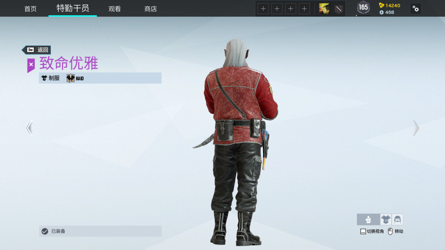 Kaid血腥宿主套装,灰白色长发,让笔者以为在玩巫师3. 尖耳朵,缩小的瞳孔,干裂的脸部皮肤,两侧嘴角上翘开裂,一排尖牙用于吸食献血。Kaid的下巴中央是分开的,只是由胡子遮蔽而已。