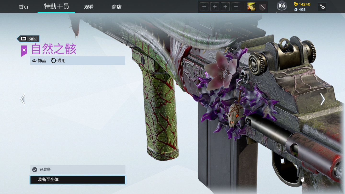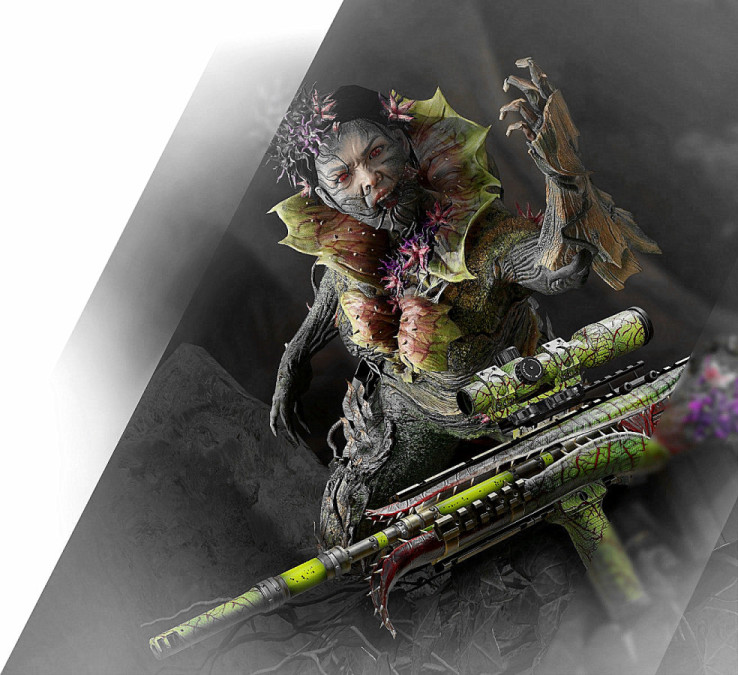 食人花触须皮肤,枪体由上下两片植物叶片包裹,叶片内的牙齿类似捕蝇草咬住猎物。枪体有几朵紫花位于叶片根部,育碧祖传穿模现象使得挂件和紫花出现bug。握把处有枯叶褶皱效果。