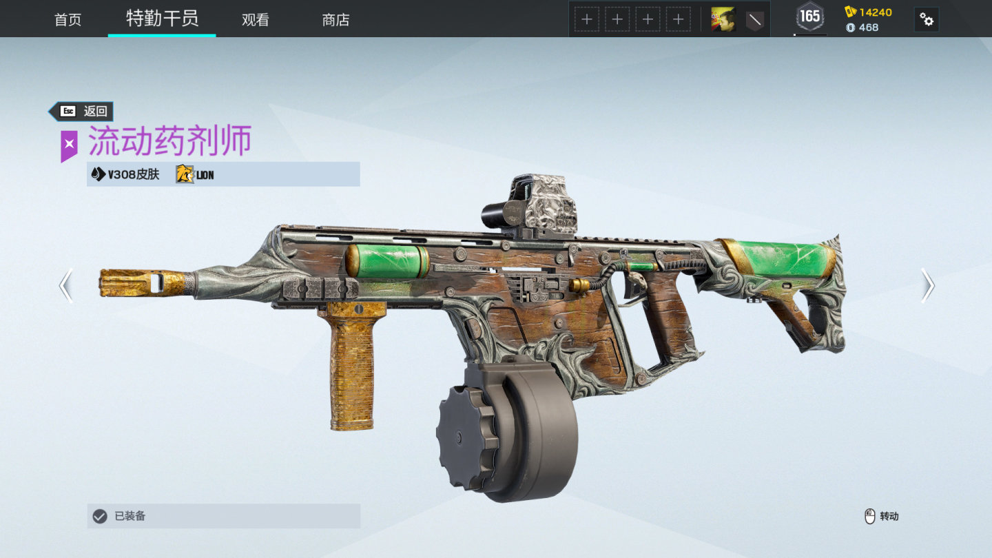流动药剂师武器皮肤,带有木质和玻璃管设计,绿色玻璃管有翡翠颜色。