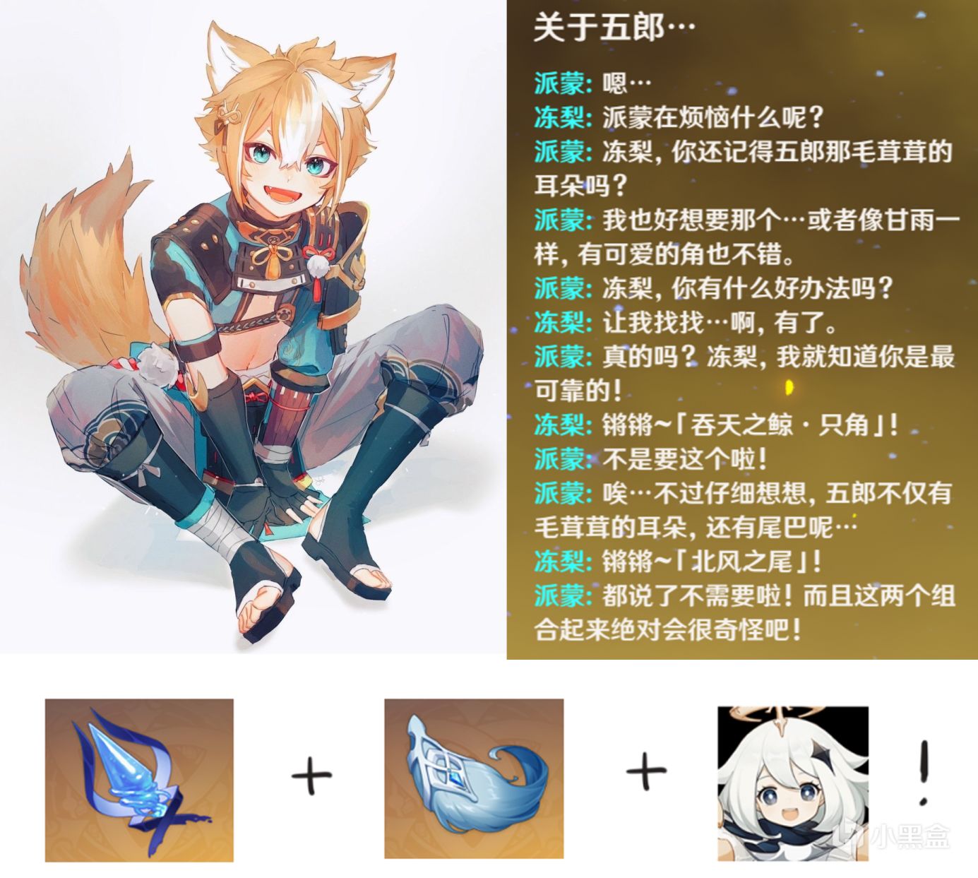 稻妻还整了一个“奇怪”的梗,源于玩家的沙雕图:只角+北风之尾。正聊着五郎毛茸茸的耳朵,突然就偏了,吞天之鲸·只角+北风之尾会变成奇怪的组合?究竟是我不对劲,还是派蒙和我都不对劲?完整的组合图冻梨就不放了,危。