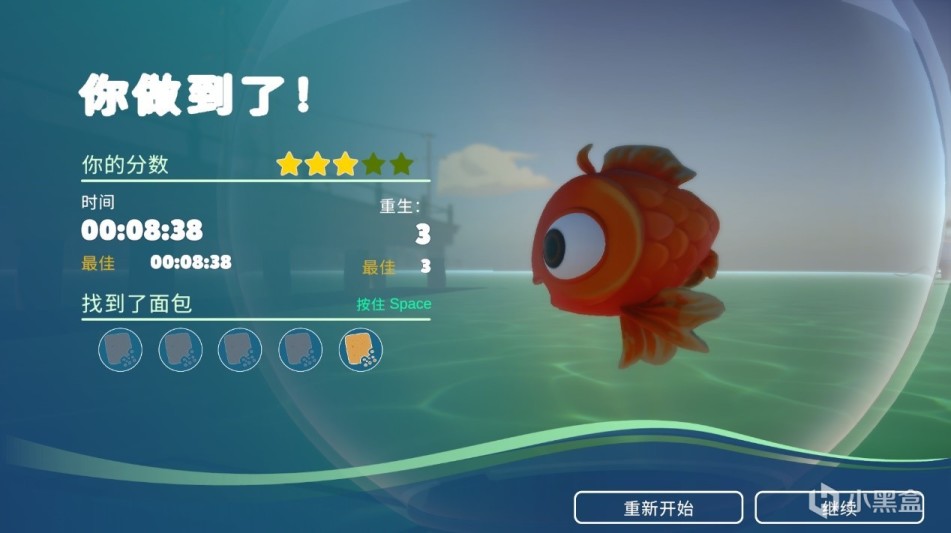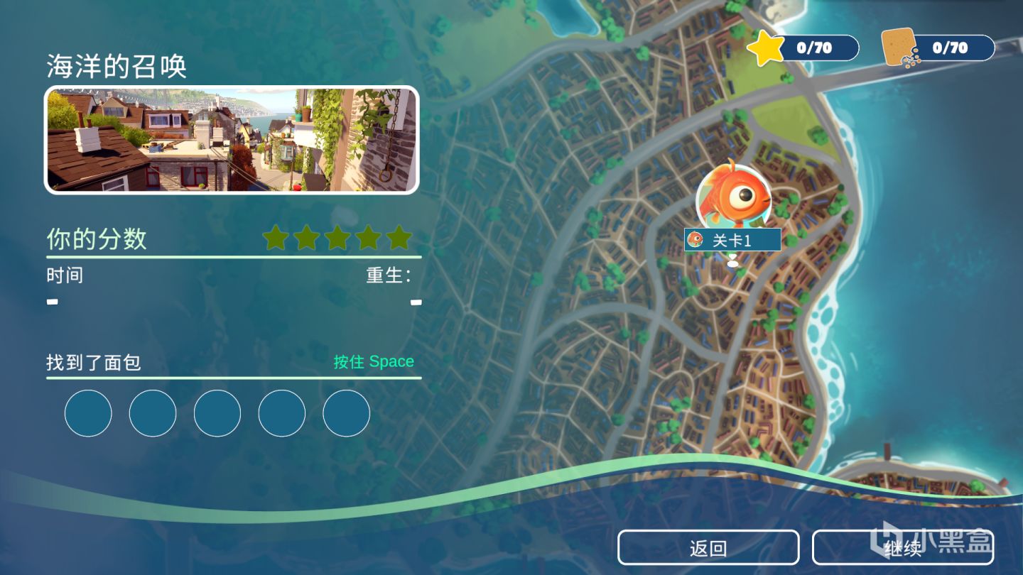 从这里可以看到,每关的最高评价为五颗星,星级是由时间与重生数计算的。同时面包的数量也为五个,分布在比较显眼或者很偏僻的地方,所以想要在高评价的同时全收集还是比较困难的,这也符合制作商的一贯风格。咱们先进关卡看看。