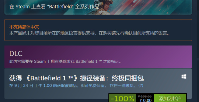 Steam喜加一《Battlefield 1 ™》捷径装备:终极同捆包