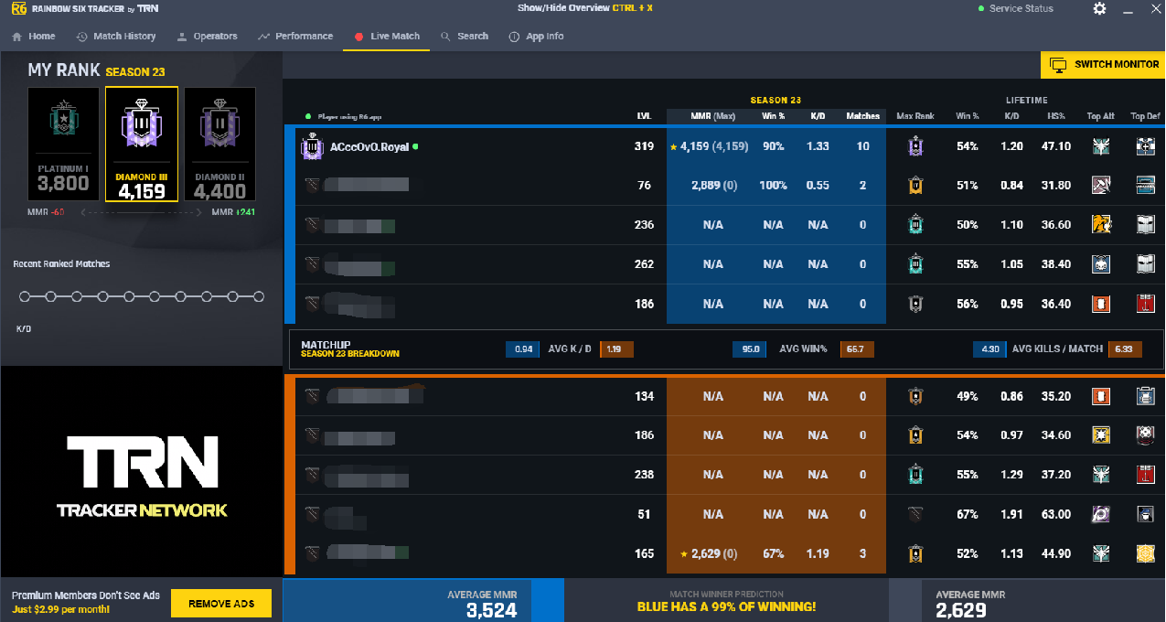 这个是R6tracker,我随便开把休闲举例,我把其他人的ID打码了,tracker的优点就是显示了比较多的信息,首先是对方的当前MMR,也就是段位,然后本赛季的胜率,以及游玩的场次数,接下来就是历史最高段位,总胜率,总KD,爆头率,以及对方玩的最多的干员。