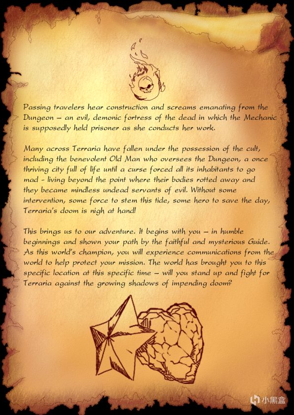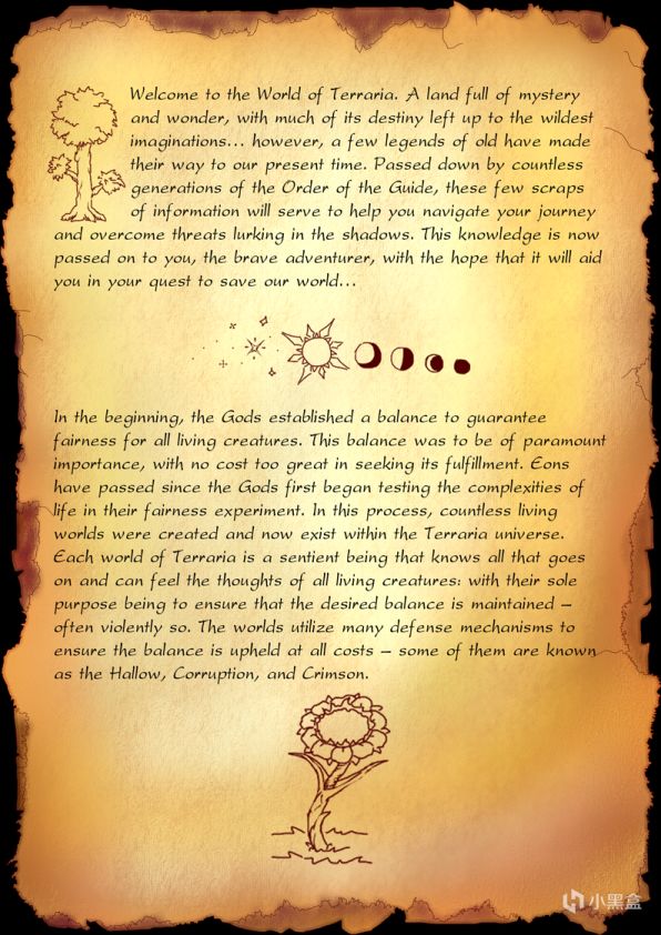 欢迎来到泰拉瑞亚的世界。这是一片充满神秘和奇迹的土地。它的大部分命运留给最疯狂的想象……然而,一些古老的传说用他们的方式流传到到我们现在的时代。这些零散的传说是由《向导指南》无数代传下来的。他们将引导你的旅程,克服潜伏在阴影中的威胁。这些知识现在传给你,这位勇敢的冒险家,希望它能帮助你拯救我们的世界.........