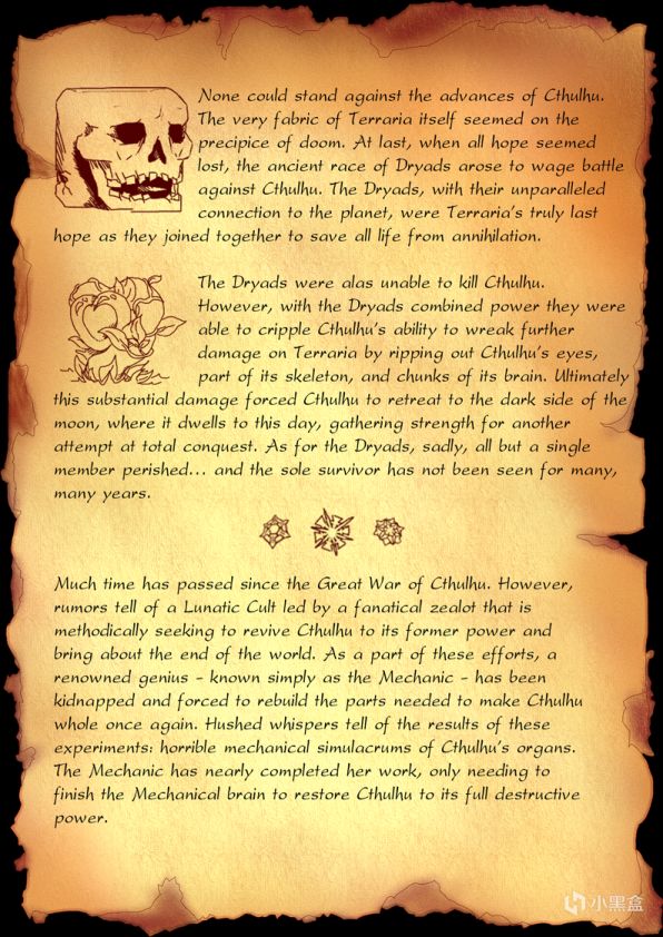 没有任何一个人能阻挡克苏鲁的进攻,Terraria的世界处在了世界末日的边缘,最后所有的希望都破碎之后,古老的树精族开始与恶魔对抗,森林女神有着与大自然的完美连接,他们是Terraria世界的最后的希望,正是因为他们,世界免于毁灭。