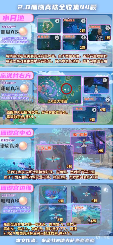 本篇目汇集2.0群岛珊瑚真珠全44个,若2.2版本出现新的点位,在第一时间更新于此篇。计划分四大块区域处理,(除采集外无目前无其他获取方式)详细讲解。为确保精简,对图片中如(图片大小,标记大小,图框,等等)做了处理,且点位密集,此次不进行图片添加。欢迎各位旅行者在评论区发表自己的见解。