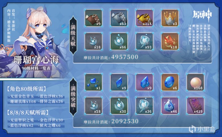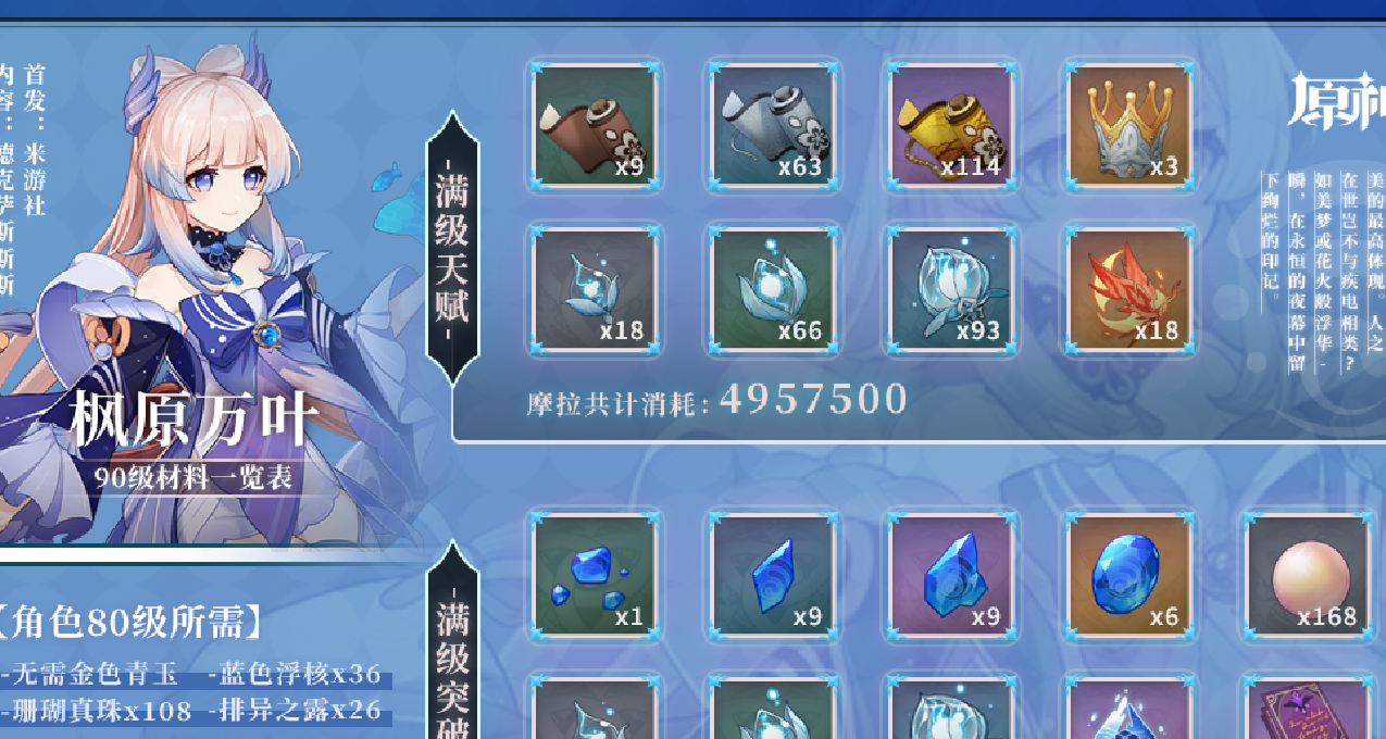 ♦图中右侧为90级以及满天赋所需,左侧为80级以及8/8/8天赋实际所需,旅行者可以自行按此进行收集,各部分材料的收集已在下方完善。狱火之蝶为女士周本材料。
