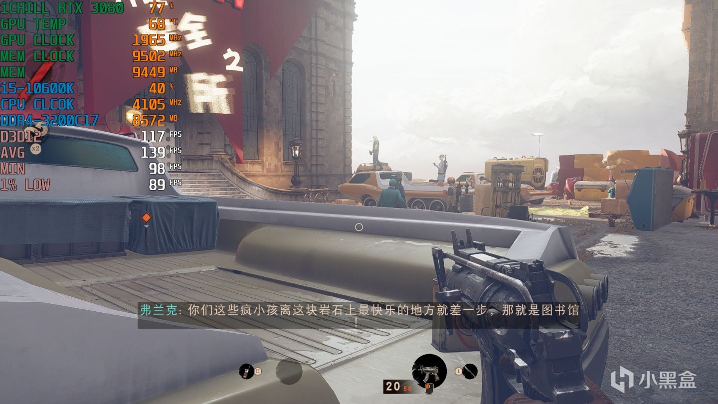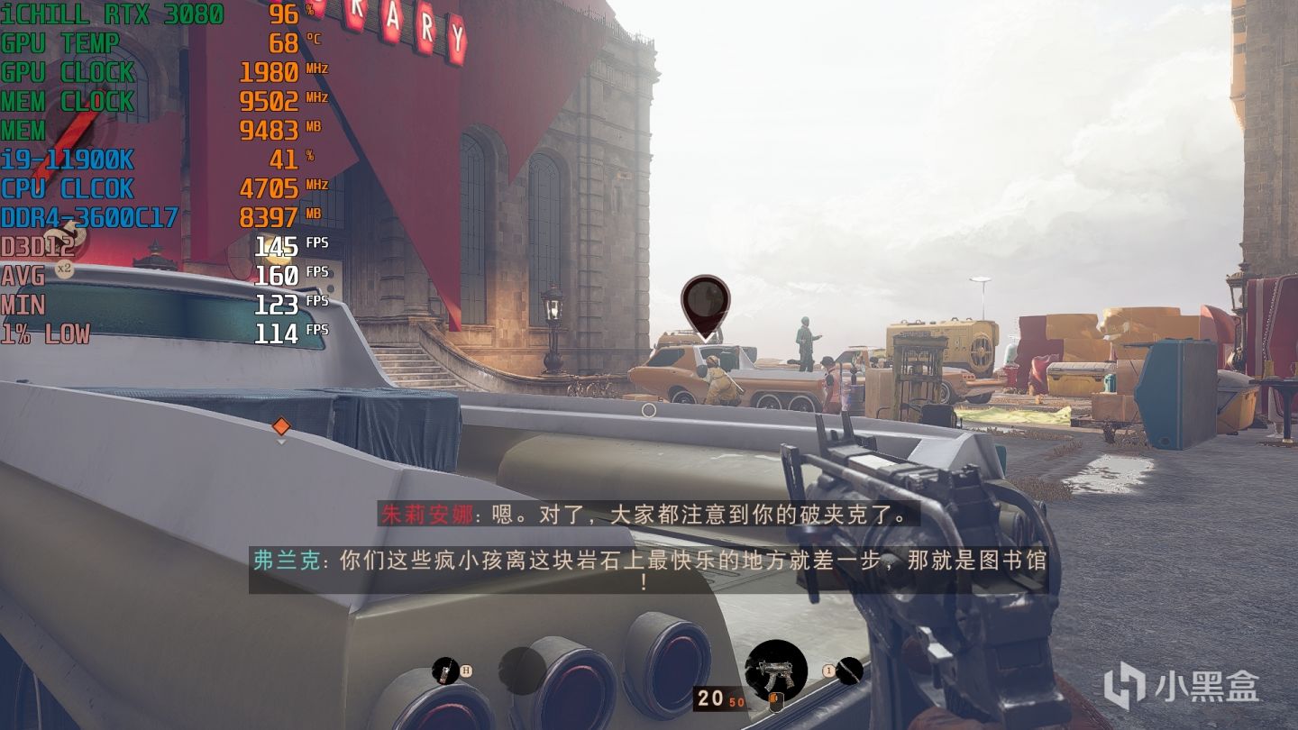 这款游戏并没有Benchmark,所以还是采用手动测试的方法,具体是选择了“探索市中心”这个关卡,从地下室出来,经过一片建筑最后来到上图这个开阔的广场后结束。整个过程场景变化挺大的,尤其是光线明暗程度,更能够反映AO光线追踪的性能,当然这个场景仅能代表着游戏中正常的场景,后期某些大幅度掉帧的异常场景,要是优化差是不可避免的。