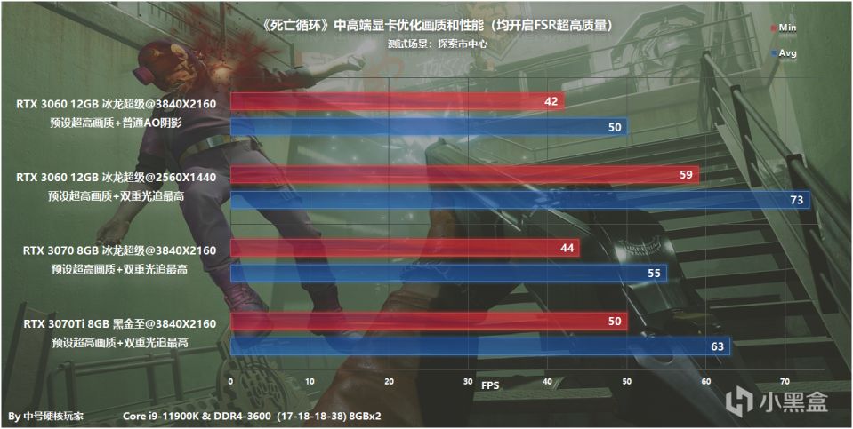 经过这样的优化处理,RTX 3060也就可以找到自己合适的定位了,对于4K分辨率不建议开启光追,保持最高画质+FSR可以达到平均50fps,对于2K分辨率只要开启FSR,光追画面很好,帧数也能达到平均73fps。至于RTX 3070和RTX 3070 Ti,开启FSR对于它们帮助也不少,已经属于基本完美流畅的水平。