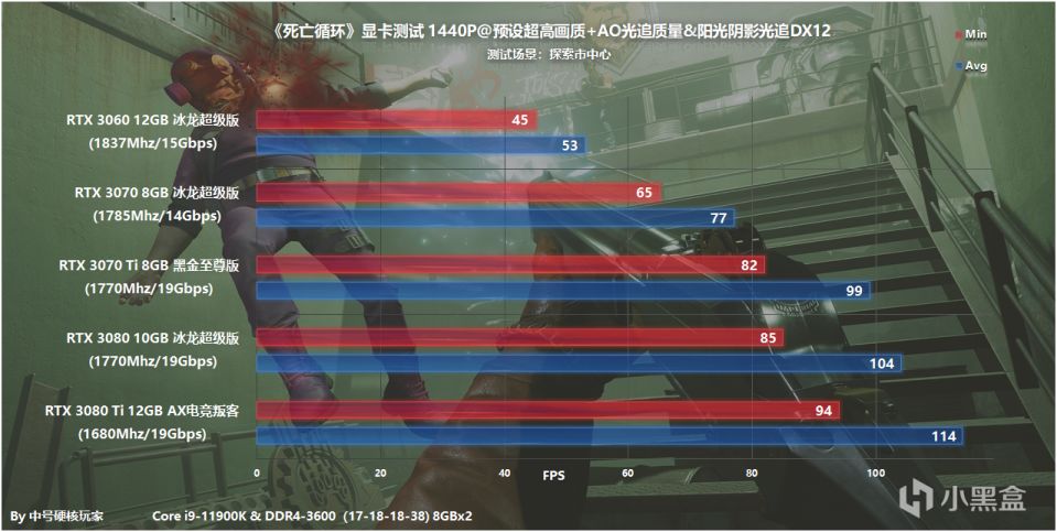 在《死亡循环》中,推荐RTX 3060 12GB冰龙超级版,2K预设超高画质+双重光追可以达到平均53fps,基本算是流畅游玩,游戏中温度控制在60℃出头,标称Boost频率为1837Mhz,实际会比公版会高一点。