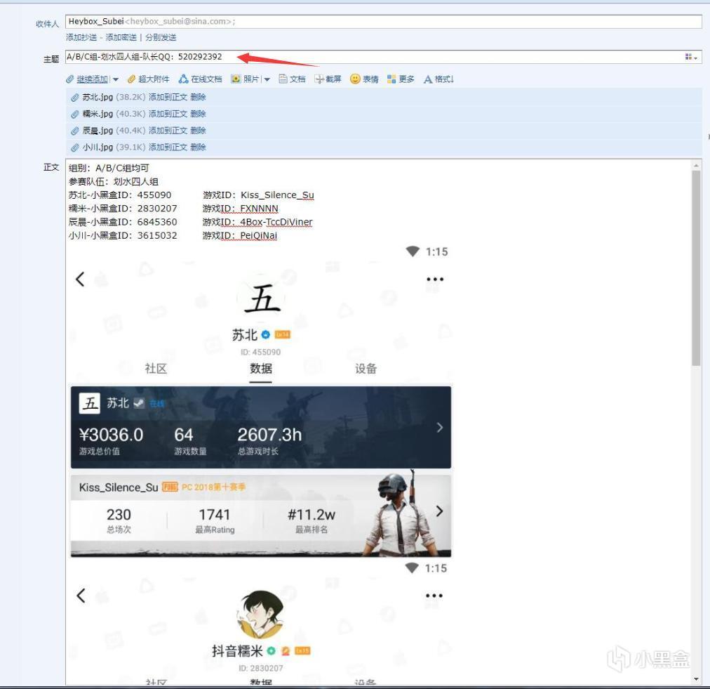 报名信息内包含:组别/队伍名/选手昵称/参赛选手小黑盒ID/游戏ID/小黑盒资料页截图