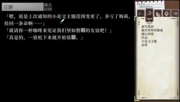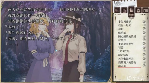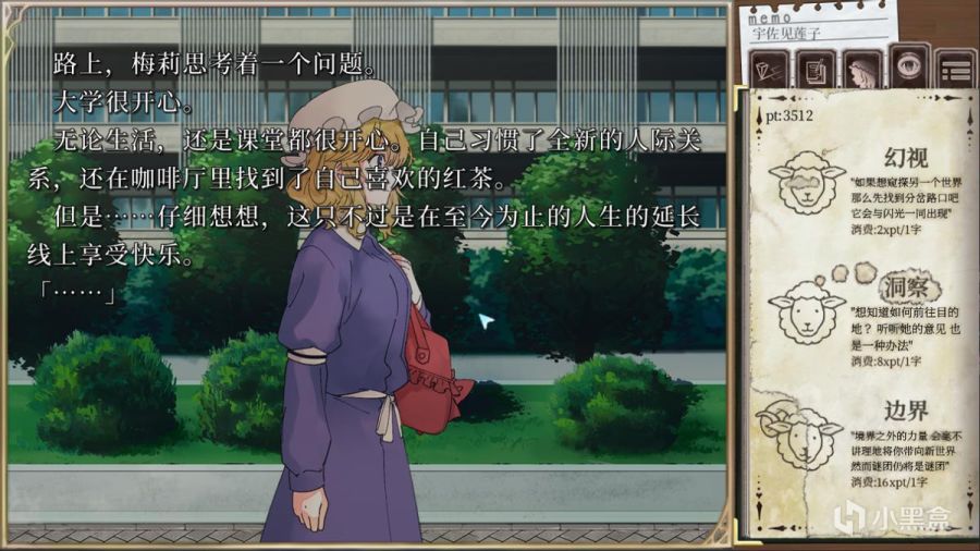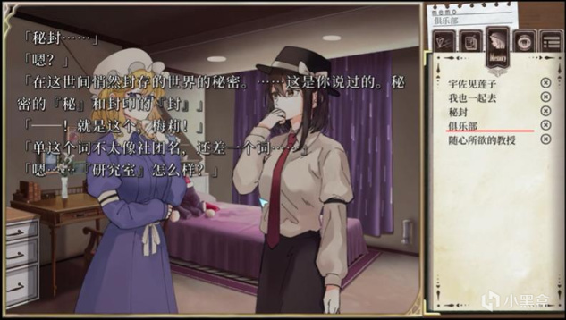 记忆碎片为游戏中寻找线索的节点,根据角色的自带技能会在此时出现闪光特效,再通过提取文本中的重要信息获得关键词,随后便记录在回忆栏中。需要注意的是游戏中部分关键词的提取比较死板,玩家需要完全贴合正确答案,这也算是此类游戏的通病,好在体验上的影响不算很大。除此之外《秘封碎片》还提供了心理活动以及跳过功能,只是效果上不如闪光特效那么直观,不过游戏的技能系统只能作为添头,本作中玩家对于操作的理解不能局限于视觉小说游戏。例如调查音乐时玩家需要等待曲目发生变化,打印相片时则需要控制等待的时机,游戏在解谜的操作上已经完全不局限于对文字的解谜了,游玩起来可以说还是很有意思。