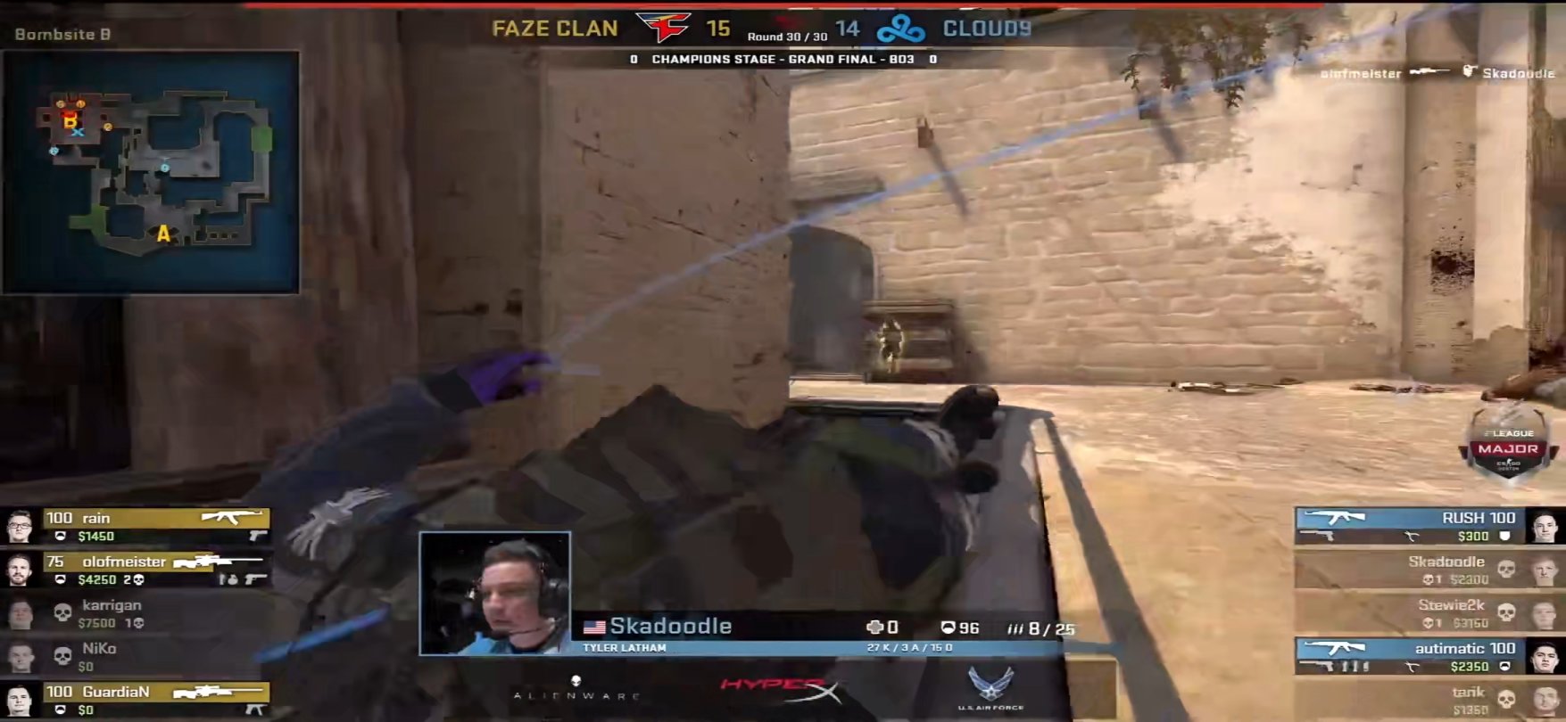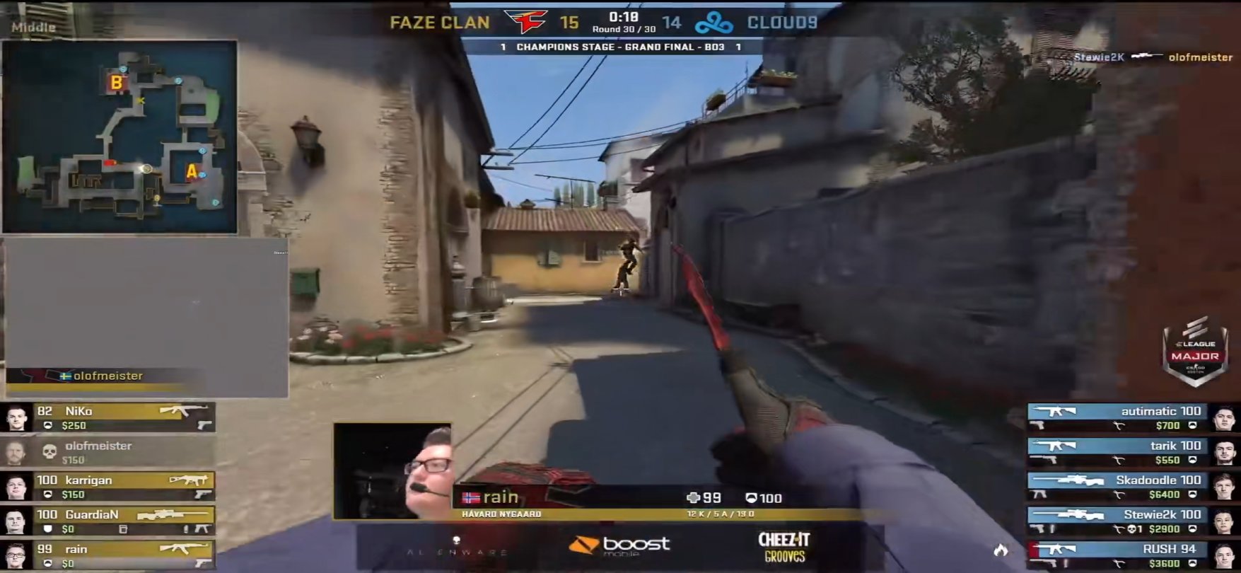 下半场第30回合Faze的冠军点局,作为进攻方的Faze被指挥karrigan叫出了默认战术,并且顺利拿到香蕉道以及A二楼的控制权,时间还剩50秒时进攻方开始清中路并且留下olofmeister一人留在香蕉道,当时间仅剩27秒左右时进攻方封了书房隔断烟以及大坑火,当所有人都认为Faze要一波进A时,karrigan下达了转B的战术指令,与此同时留在香蕉道的olofmerster想摸烟出结果被打掉,随后就出现了躲在三箱的stewie2k大狙三杀的经典镜头。