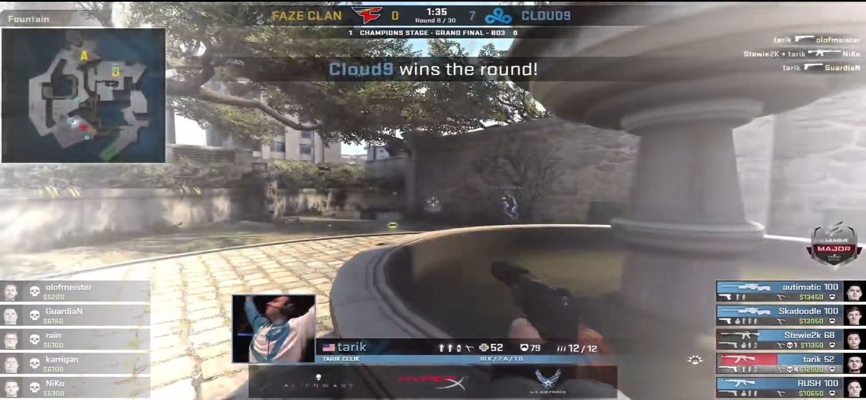 上半场第7回合,CT方开局三人前压气球以及下水道,Faze半起集合一波出匪口,恰巧这时Cloud 9前压的tarik配合队友闪光拉烟出,一波扫射压枪打掉3人,随后拿出usp点掉最后1人,拿下四杀!(本来这波应该是tarik的一个ace,不懂事的stewie2k抢了一个tarik打了大残的人头)