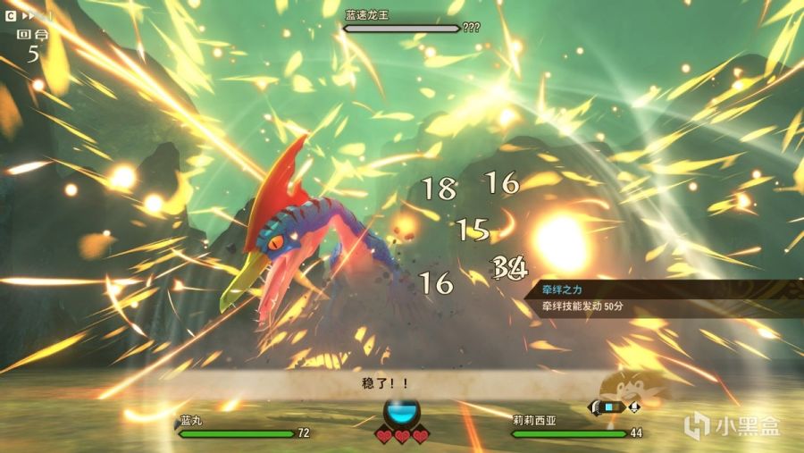 我更想展开来说的是攻击方式。本作的攻击方式可以分为三类,一类是普通攻击——普通攻击又分为力量、速度、技巧三种,之间是循环克制的关系,您每次可以从中选择一种,但请切记别让我方处在被克制关系中。而技能同样具有力量、速度、技巧三种类型,克制关系也同样存在于这里,需要说明的是技能方面的掌握限制很小,因此您完全可以见招拆招、使用完美克制对方的进攻策略。在攻击时会积累牵绊槽,当牵绊槽满了后就可以进行战斗中骑乘,所谓人兽合一(?)不但能回复体力还能发动威力巨大的牵绊技能。此外还有与人类伙伴一起发动的双人牵绊技能,这本质上也就是更华丽一点的技能。