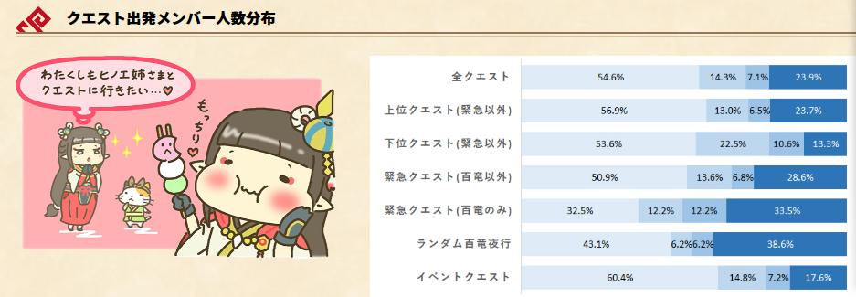 任务出发时的团队人数:可以看出在多个种类的狩猎任务上,单人作战始终占据最大比例,多数超过半数比例。