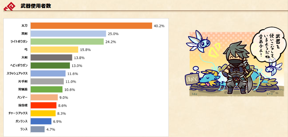 猎人爱用武器排行:太刀以40.2%的比例登顶。