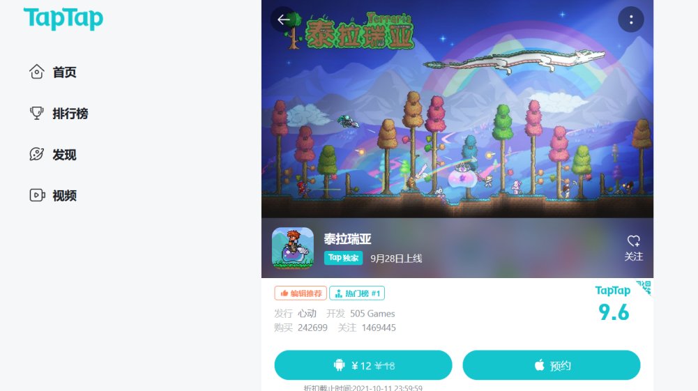 由心动网络代理的《泰拉瑞亚》移动版正式在TAPTAP等平台上开启了发售,游戏依旧采用买断制,售价12元。