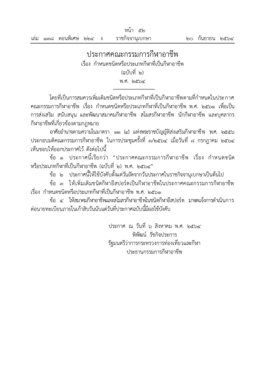 泰国电子竞技联合会(TESF)分享了泰国官方报纸《皇家公报》的一份通知,表明电子竞技现已被泰国官方认可为职业运动。