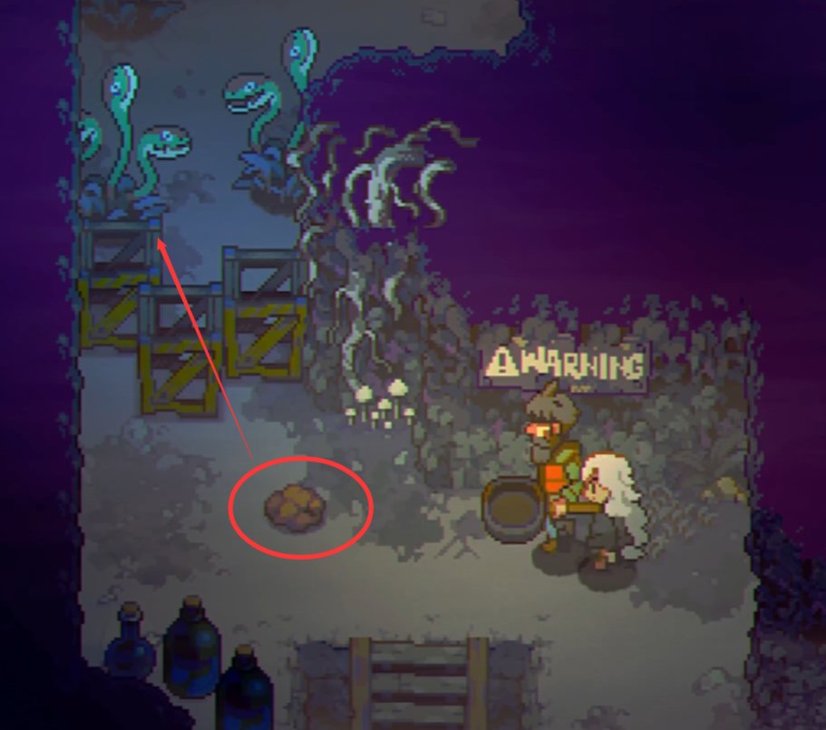 “会说话的垃圾桶”:对话大坝城中可疑的垃圾桶,一共三次。第一次在十八铺这个位置,他会告知你湖心岛有好东西(珊的护盾能力);