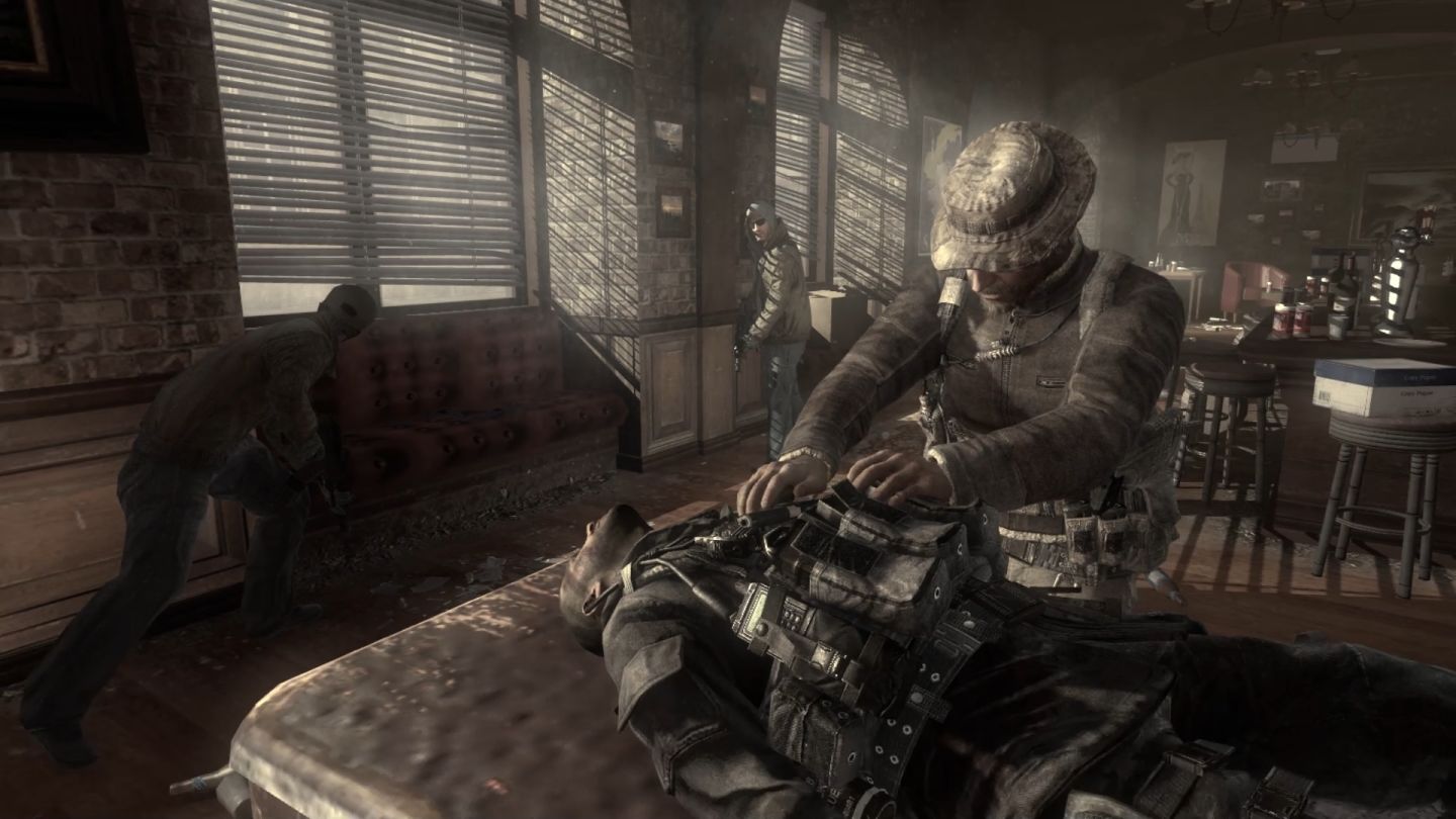 这段序章设计就是放到现在也依然是教科书级别。前半段甲板突袭是对玩家之前训练的考验,玩家会发现之前的训练并非单纯的教程而是丰富人物形象的一种手段并让玩家更容易将自己带入到肥皂这个新人的视角里,相比之下后来《荣誉勋章:战士》的训练关就只是单纯的训练,相当无趣;而后半段的船体撤离更是将紧张的氛围渲染的十分出色,也让最后普莱斯的营救效果最大化,成功让玩家在心里确立了普莱斯果敢,护短的队长人设。