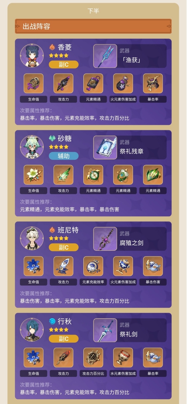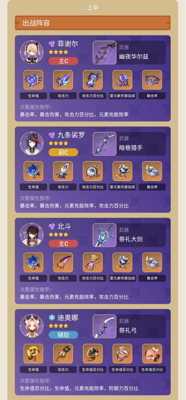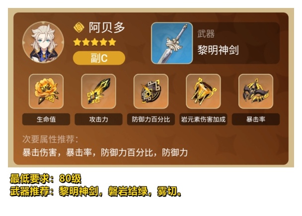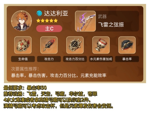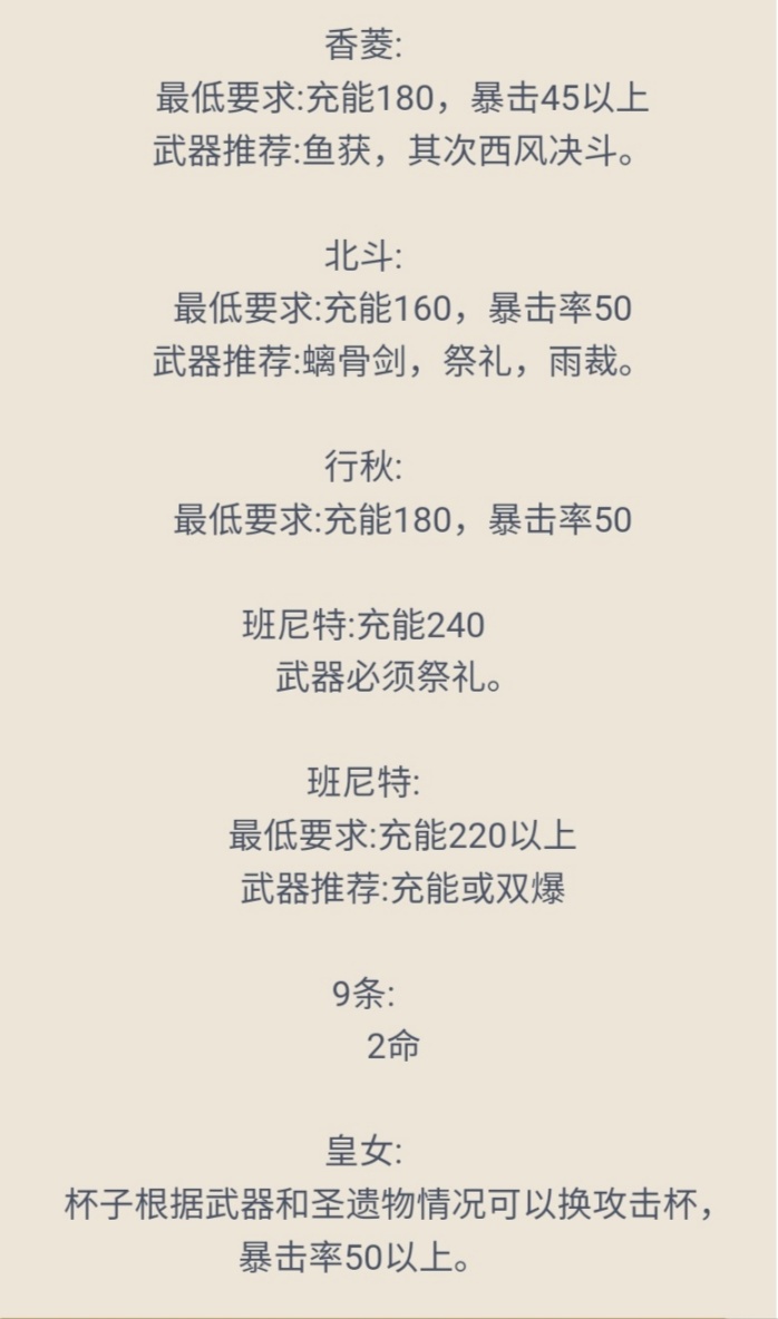 注意:以下所有角色5星均是0命,所有武器和时之沙皆可以更换,只要必要属性达标怎么穿都行,有什么用什么。不要纠结图片里都是5星武器。所有角色5星使用的天赋等级最低要求8级,4星角色建议11级。