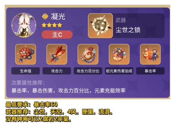配队思路:凝光钟离互相充能还能套盾,双冰加暴击减CD,双火加攻击。