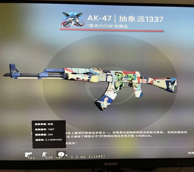 像我本人就比较喜欢偏文艺类的皮肤,所以这把AK的出场着实震撼到我了,以至于一出来我马上就去入手了一把。AK47抽象派在游戏中的效果观感花哨鲜艳,却有一种非常新奇的体验。