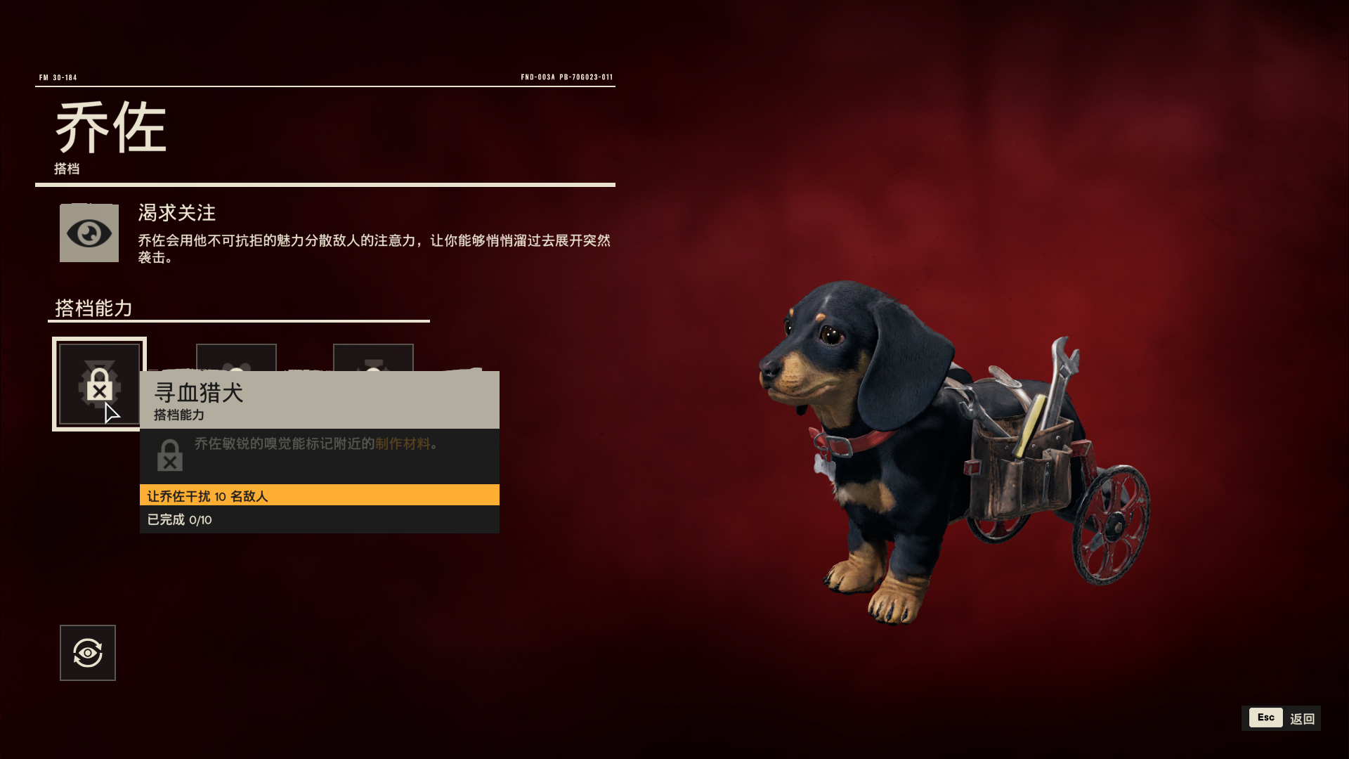 乔佐在游戏中同样是玩家的搭档之一,他作为潜行流派的狗狗。第一个技能就是寻血猎犬,这个当时看到的时候,也是感觉十分有意思。估计阿育在本土化的时候,肯定也是故意来有意引导到这边的。