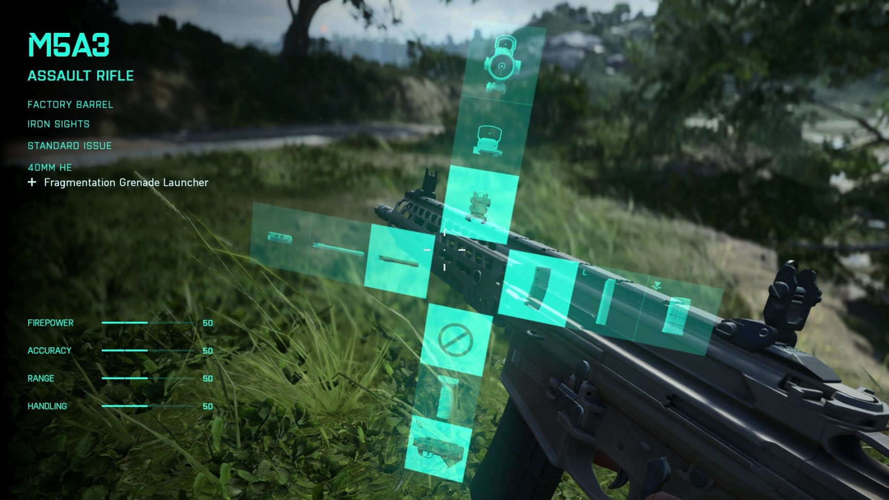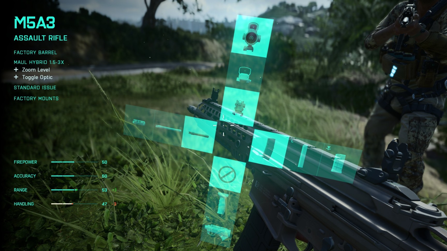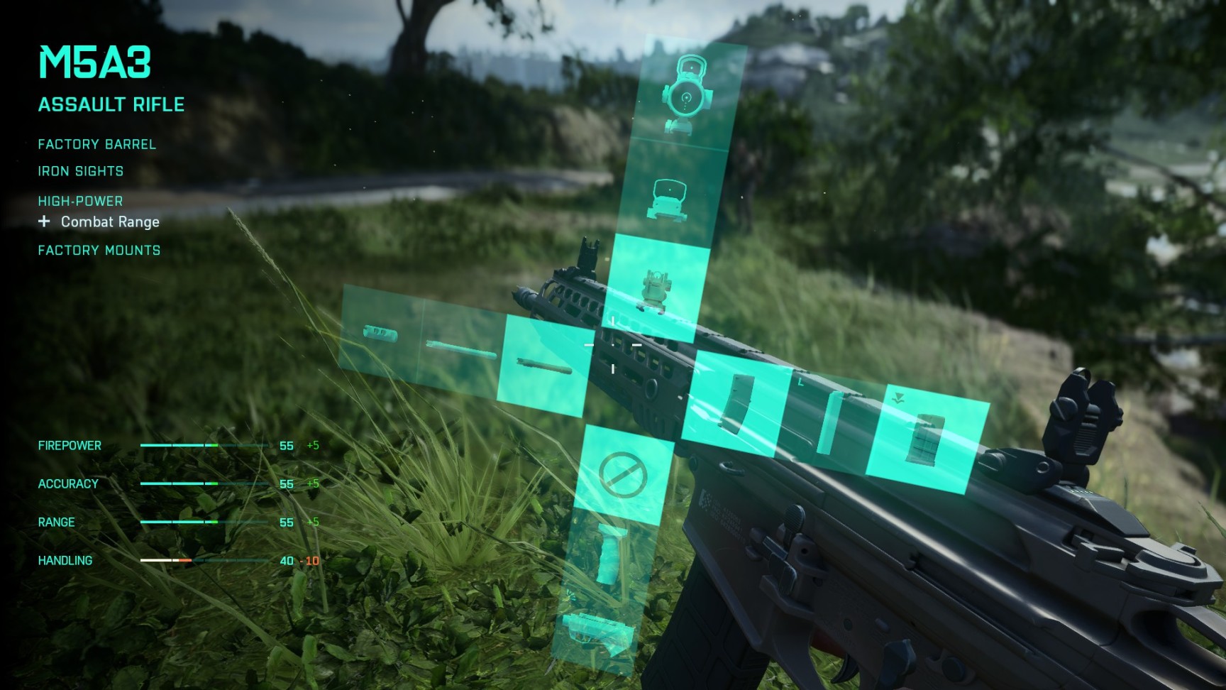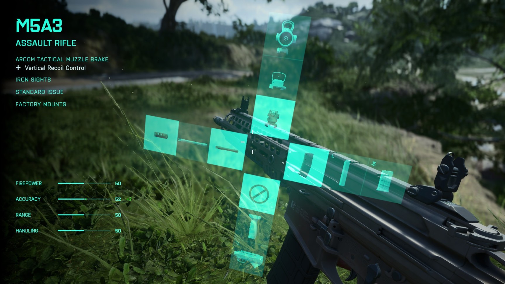 以上是突击步枪M5A3的所有配件,由于这把枪后座比较小(相比另一把我们等下会提到的自动步枪),推荐着重威力和精准度(如果你有信心控制好连续开火的后座的话),这个都可以根据情况自己调整。我使用了Maul Hybrid 1.5-3x 望远瞄具(瞄具3,地图大,很多时候需要在中距离内准确开火),close combat弹匣(弹匣2,因为我自己的后座控制不是很利索),Cobra Grip 握把(加精准度的,不用白不用),extended barrel枪管(枪管2,加弹速)。需要避雷的是下挂榴弹发射器,虽然看上去很好使,实际上很难炸死人(需要准确判断弹道开火,最要命的是威力非常有限),不建议用。