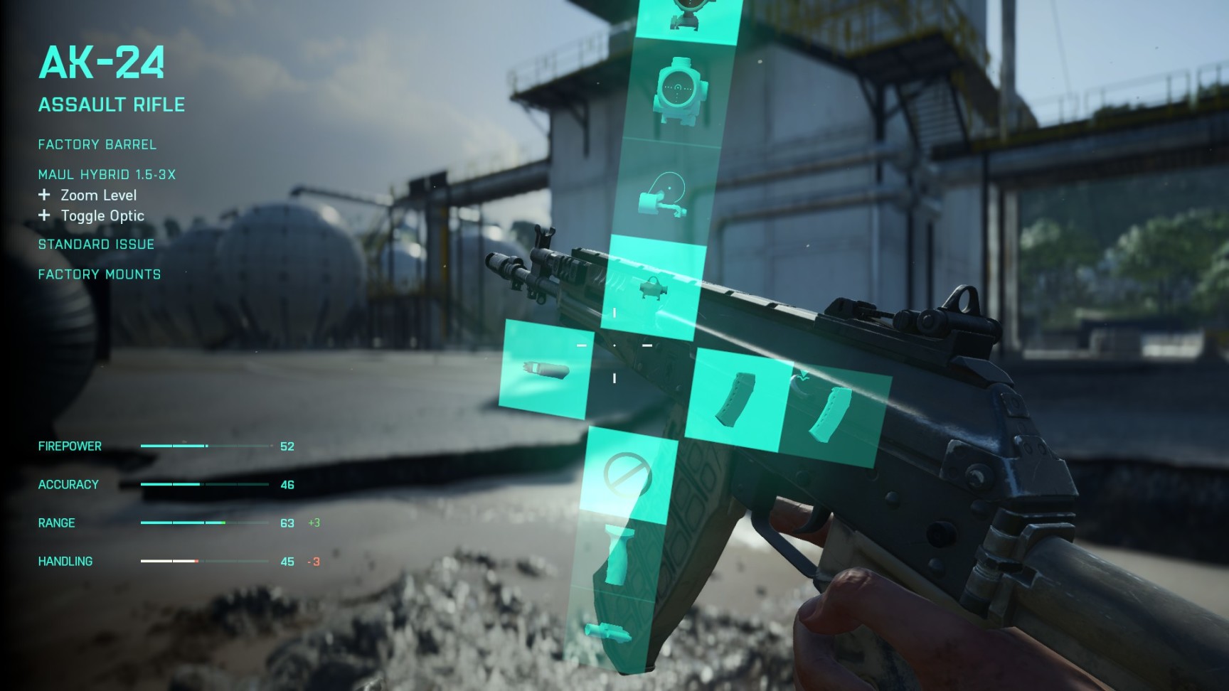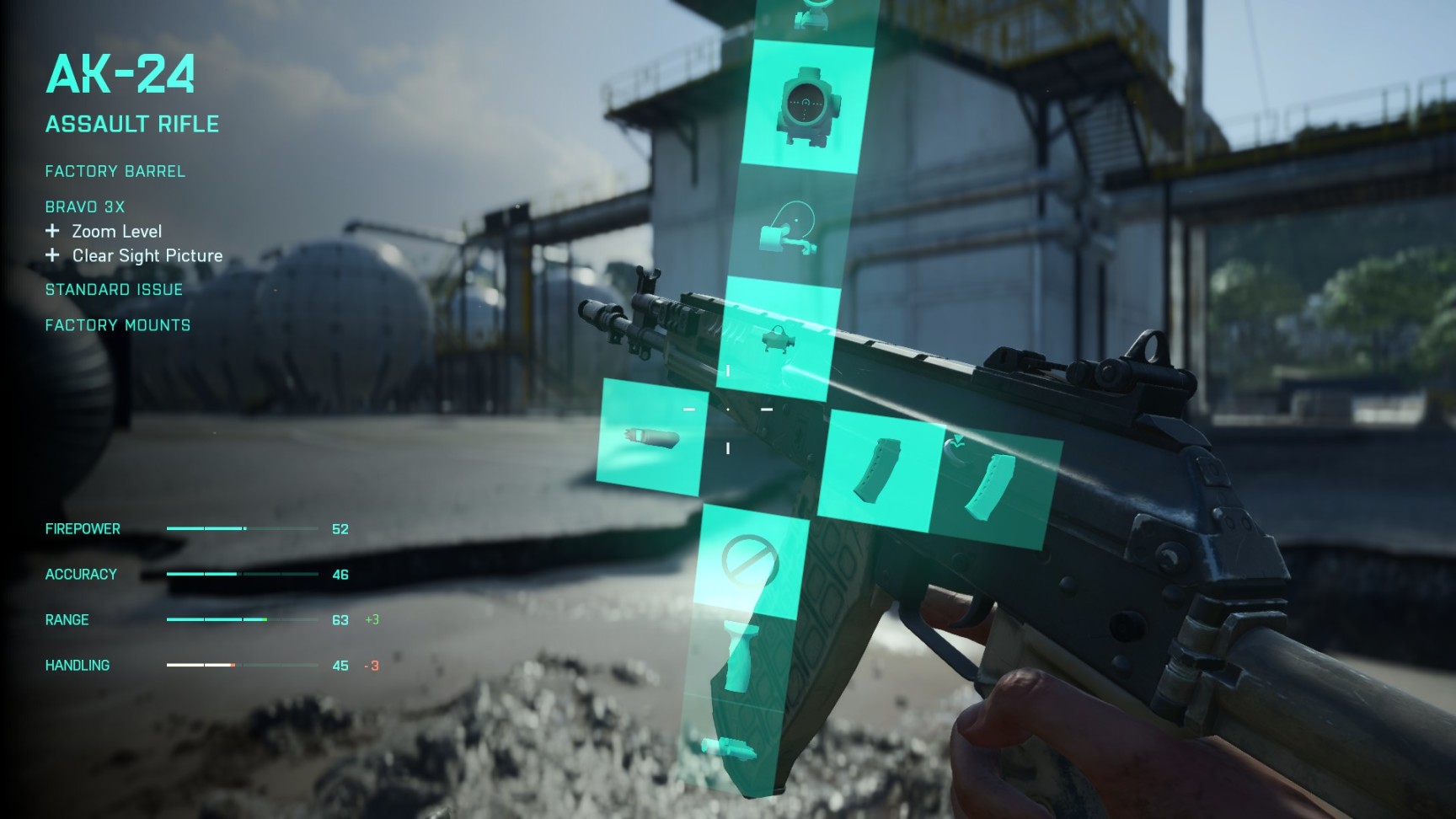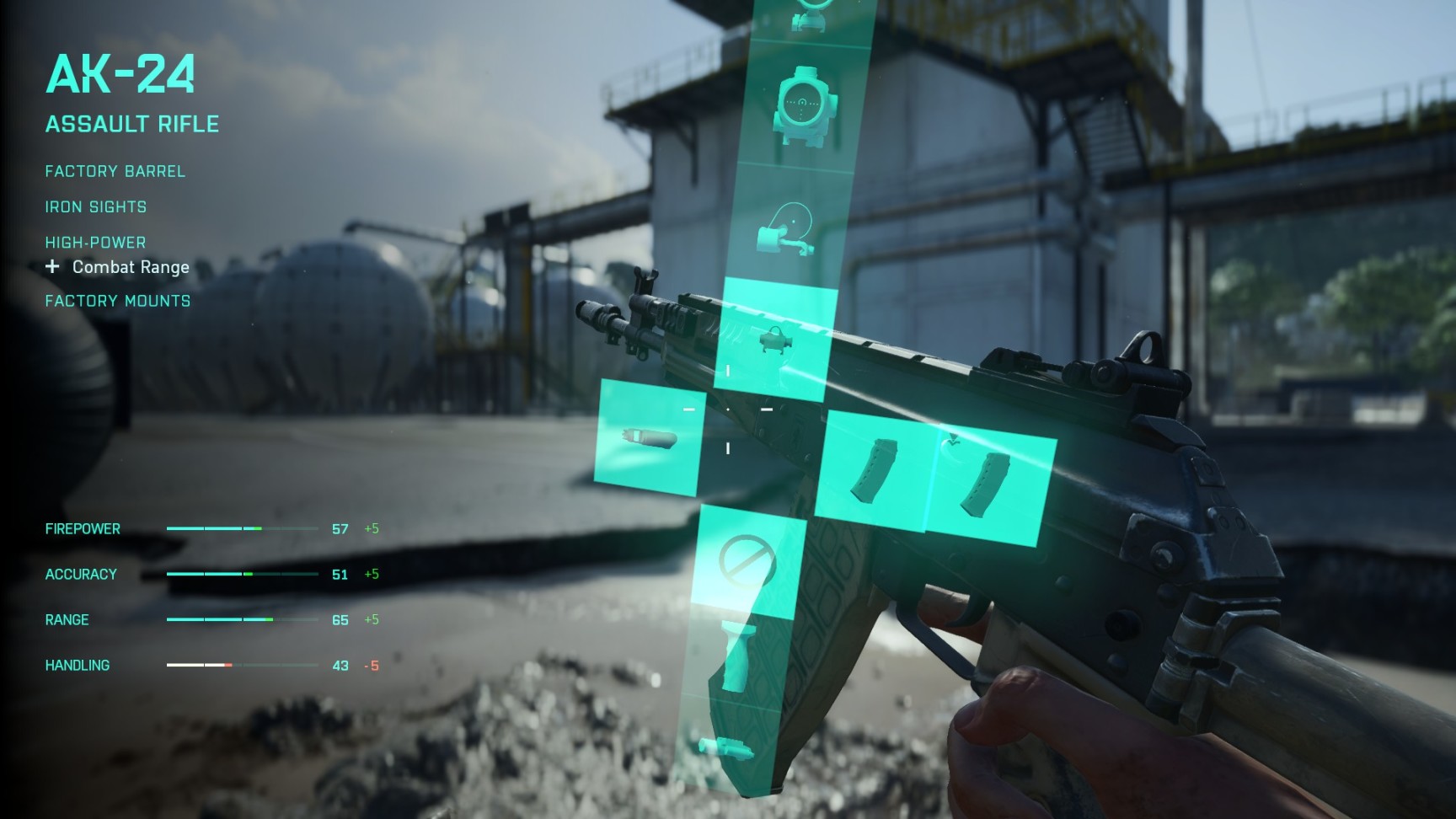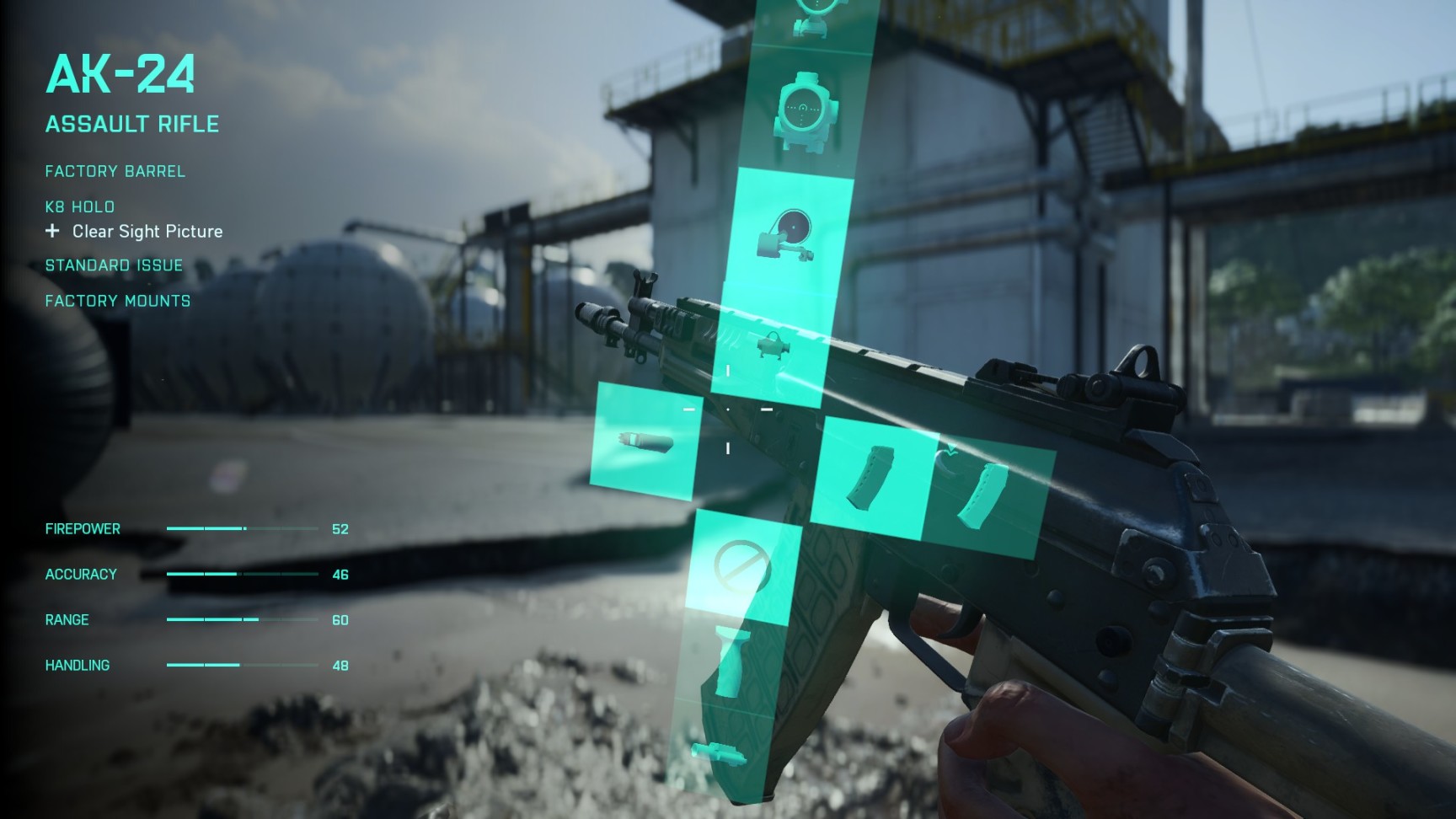 相比前面那个美军的M5A3自动步枪,俄军的AK-24后座更大一些,这把枪我用得很少。根据上图可以看到多了一个瞄具,少了两个枪管(枪口),少了一个弹匣,配件从下挂榴弹发射器换成了手电筒(这俩似乎都没什么用)。这把枪我装上了K8 Hold瞄具(瞄具2,反射瞄准镜,以近距离作战为主),Hi-Power弹匣(加威力和精准度),Cobra Grip握把(加精准度和射程,反正手电筒没什么用,干脆就装这个握把了)