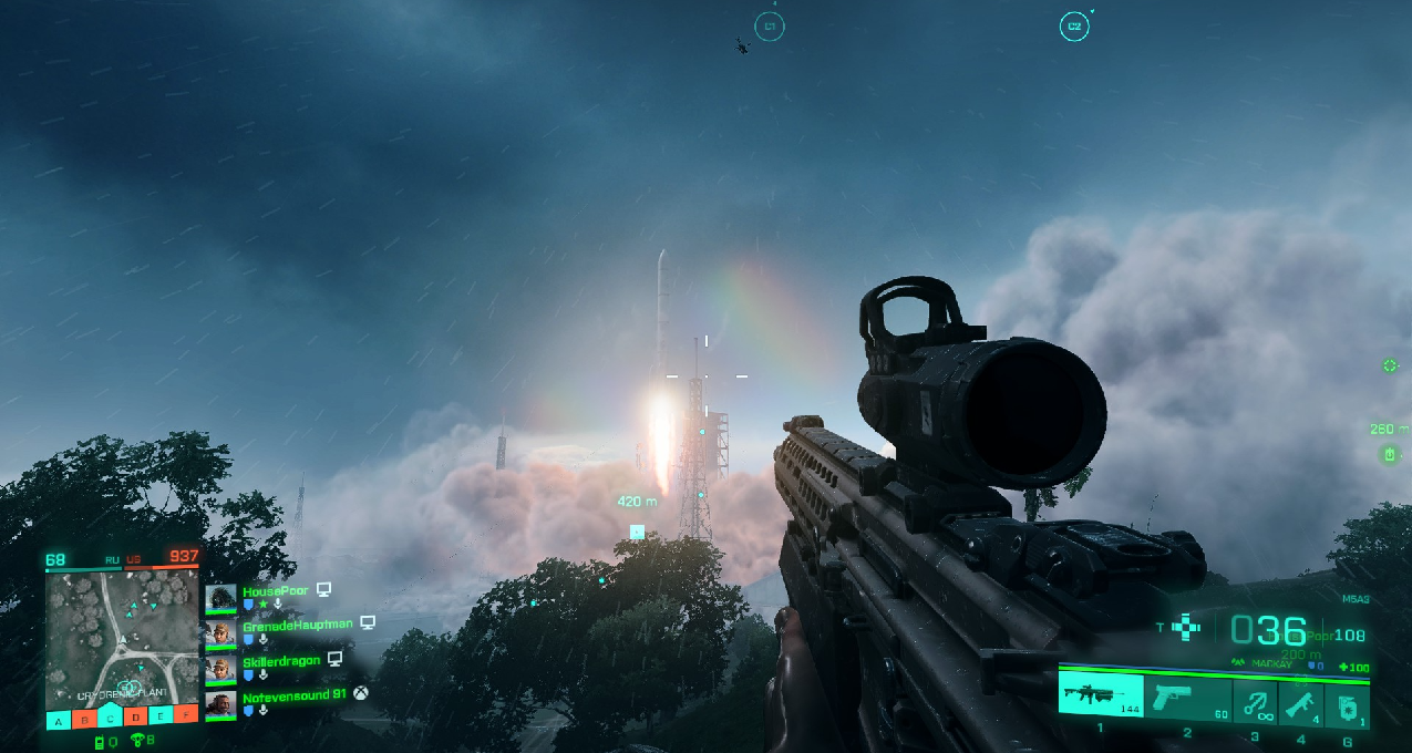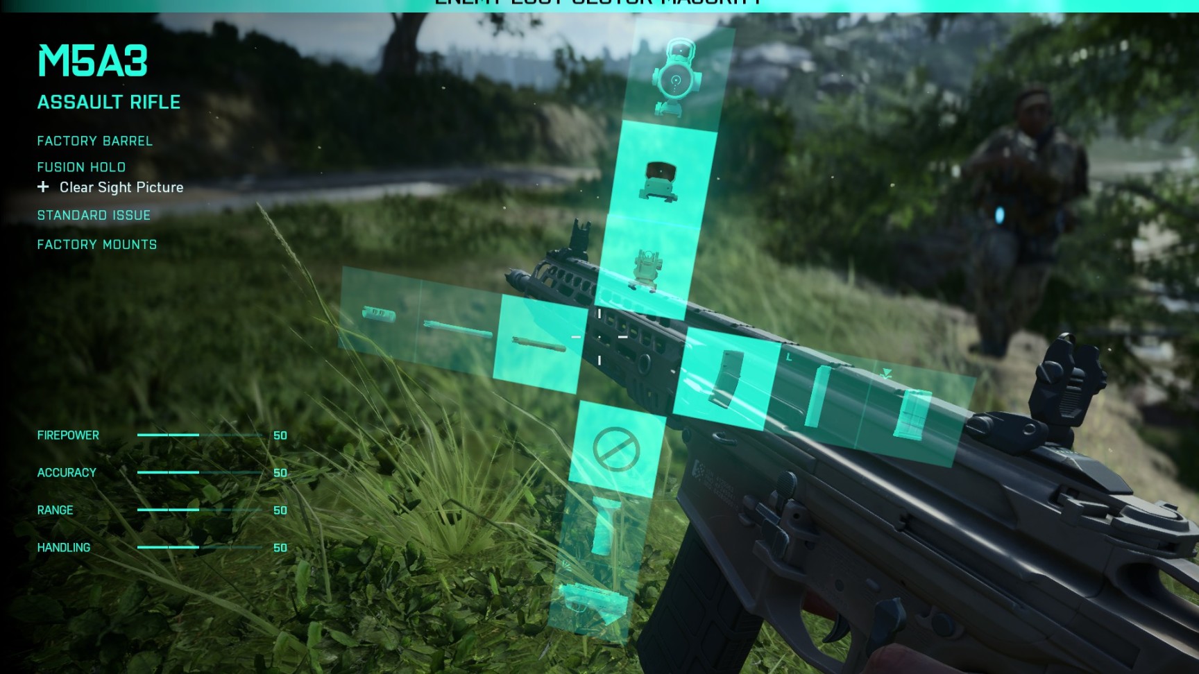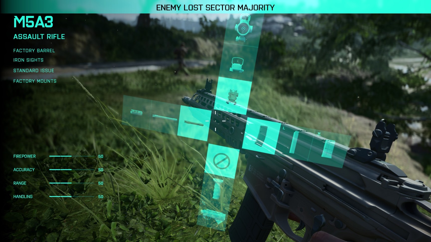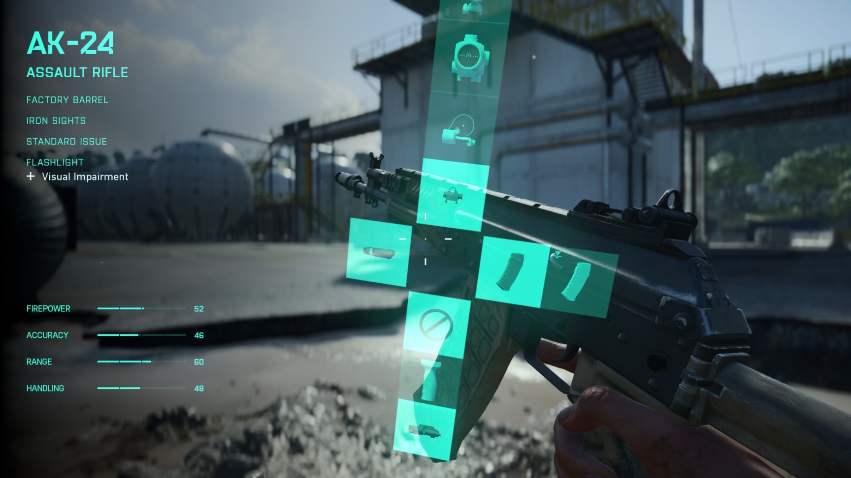 相比前面那个美军的M5A3自动步枪,俄军的AK-24后座更大一些,这把枪我用得很少。根据上图可以看到多了一个瞄具,少了两个枪管(枪口),少了一个弹匣,配件从下挂榴弹发射器换成了手电筒(这俩似乎都没什么用)。这把枪我装上了K8 Hold瞄具(瞄具2,反射瞄准镜,以近距离作战为主),Hi-Power弹匣(加威力和精准度),Cobra Grip握把(加精准度和射程,反正手电筒没什么用,干脆就装这个握把了)