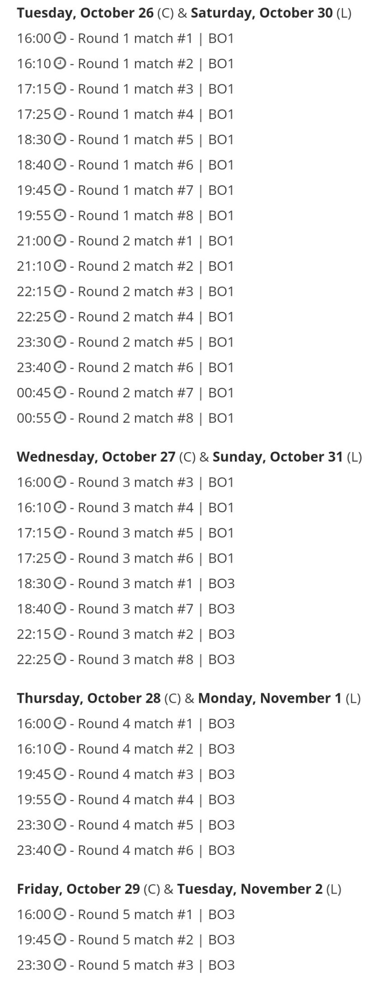 以下为挑战者组以及传奇组的日程安排(注:C表示挑战者组,L表示传奇组):