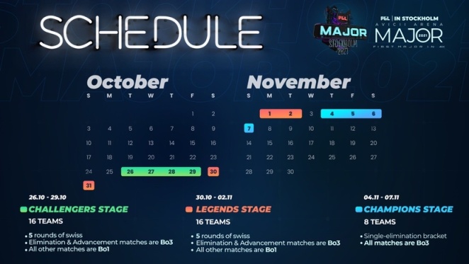 PGL于近日公布了斯德哥尔摩Major各大阶段的具体日程安排。这场共有24支战队参加的赛事将于10月26日至11月7日间举行,总奖金池为200万美元。
