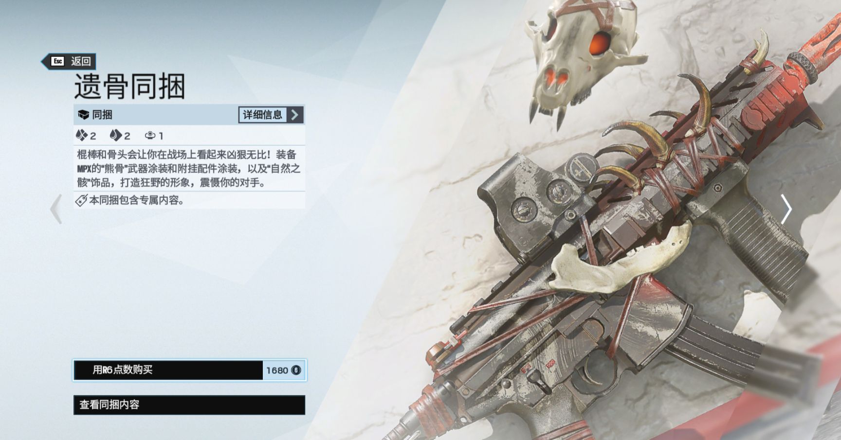 【遗骨同捆上线】棍棒和骨头会让你在战场上看起来凶狠无比!装备MPX的“熊骨”武器涂装和附挂配件涂装,以及“自然之骸”饰品,打造狂野的形象,震慑你的对手。