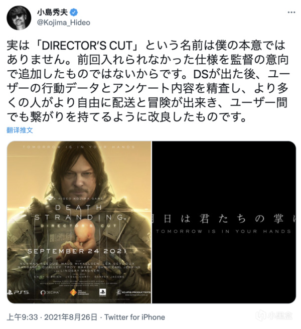 “导演剪辑版”这一概念似乎在今年特别火,这个词确实是很早就有了,但自《正义联盟》以来,听得越来越频繁——《对马岛之魂 导演剪辑版》《极乐迪斯科 导演剪辑版》,还有《死亡搁浅 导演剪辑版》,我觉得电影使用这个词丝毫没问题,毕竟导演真的会不参与剪辑,但游戏使用,是否会有点太过不严谨了呢?就连小岛秀夫都认为,《死亡搁浅》全部内容早就在2019年发售的时候,没有保留的全部放出来了,而这一次的“导演剪辑版”只是增加了内容,就他而言,是不喜欢这个称呼的。