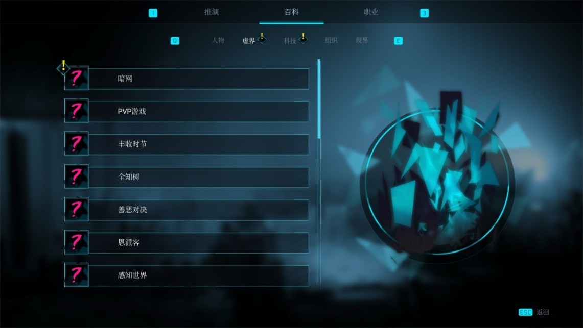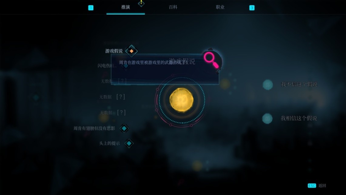 同时,当玩家和场景交互、和npc对话互动,会逐渐解锁很多词条的解释,包括他们基本的含义和暗网、小道消息等的信息,这些词条的诠释也不是简单的介绍,而是通过类似对话场景的文本来展现,蕴含了不少趣味。但是,随着游戏的推进,这些词条不断地呈现在玩家眼前,伴随着很多个黄色感叹号,大量的新概念和文本内容使得我在游玩时有一种疲惫感,不愿意去读完这么多冗长的内容。我认为《骇游侠探》不妨借鉴很多RPG游戏把信息藏在对话和书信的做法,让信息传递显得更加自然和容易接受,现在的信息传达未免过于粗暴和生硬。