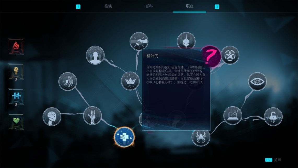 《骇游侠探》的RPG系统相比其他游戏来说并不复杂,游戏里没有战斗玩法,主要的玩法集中在对话和推理上,主角的属性被划分为四种,四种属性下还分别划分了八种具体的小属性,通过对话或一些选择可以取得小属性点,从而获得红黄蓝绿的大属性点,再通过大属性点去购买一些技能,这些技能可以解锁不同的对话选项。但是,小属性点的获取仅仅作为获得大属性点的依据,而没有作为对话的检定依据,这是和其他经典CRPG游戏玩法不同的地方,可以说是一种简化,但也显得有些粗放笼统。游戏游玩初期,属性点很有限,因此加点的选择很大程度上影响了对话选择,可能会出现完全不同的过关流程,但是游戏的剧情是线性的,因此殊途同归。