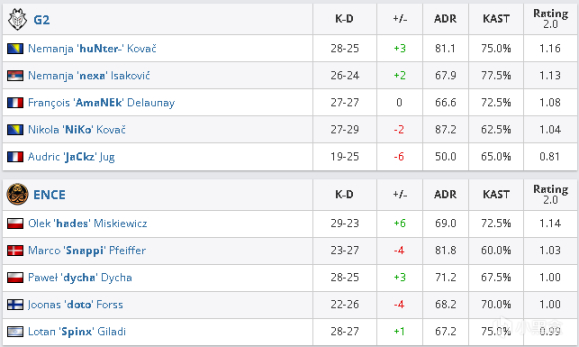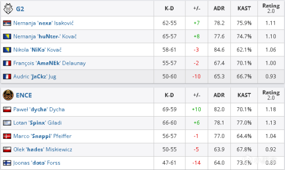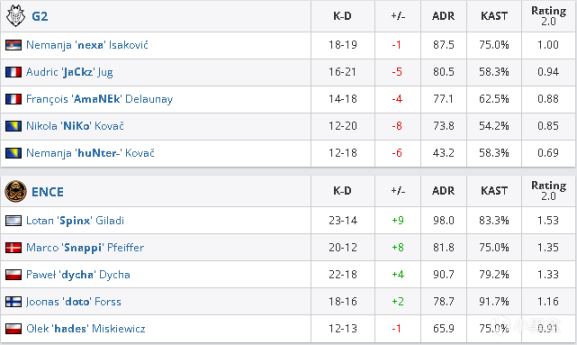 二十二回合ENCE的A点一波流收获颇丰,补枪迅速的他们一换二进入包点,拱门Amanek的大狙也被中路走单的doto偷掉,ENCE再拿一分。二十三回合ENCE封烟上B小,白车的jackz打了两个又在烟里拖了很长的时间但是队友的回防并没有帮他减轻压力还被全部架住,dycha藏烟闪靠着枪械优势和jackz互换一枪头不过人数优势的ENCE还是拿下了赛点。二十四回合g2开局A二楼二换一,随后ENCE进行A点爆弹,二楼下的nexa白打一个之后也难以打出连杀,铺开阵型的ENCE没有给g2挣扎的机会,16-8拿下对手的选图。