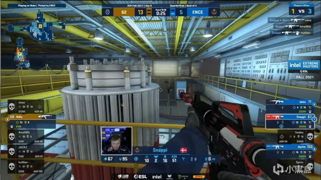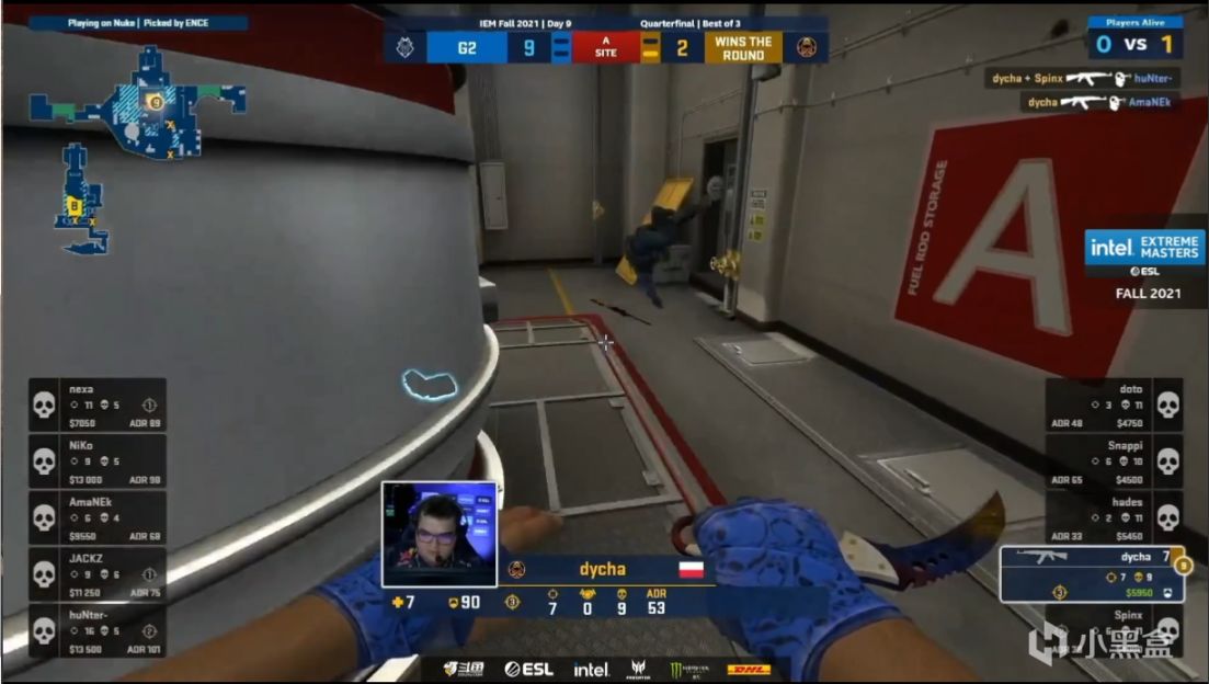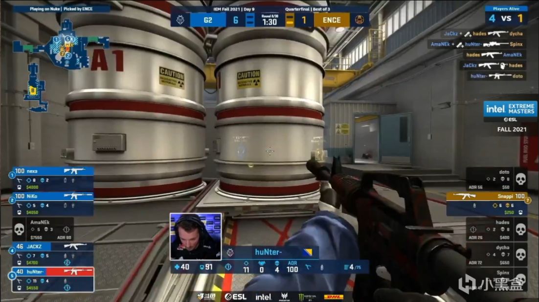 第五回合ENCE外场封烟dycha抢进大仓,正门烟并没有封住Niko,他摸出烟雾架住大仓先拿到首杀,随后包点的hunter拿到三杀帮队伍再守一分。第六回合虽然ENCE的A点爆闪强出顺利拿到首杀,但是三楼上的jackz用离谱的定位还了两个爆头,配合随后队友的回防拿下这回合。第七回合Niko没打过dycha先掉首杀,随后主铁板的nexa面对ENCE大军也只打出一换一,死门hunter抓timing拿下双杀终于被管下的dycha补掉,snappi终究还是没等到摸的非常慢的Amanek被抓背身,dycha1打2先打一边也没打过Amanek,下一回合g2直接靠着正面刚猛无敌的枪法解决问题,再赢一个半起后比分来到8-1。