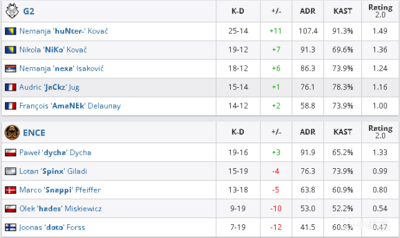 十二回合Niko摸到k1偷到hades背身,doto想摸正门也被hunter架住,三楼下Amanek再狙掉一个,ENCE全员分散没有补枪各点掉人使得g2再拿一分。十三回合Nikok1反摸又找到了侧身,配合队友又架死了大仓的dycha,ENCE只能下B,残局阶段hunter、jackz全都完成了高难度补枪,五打三的他们没有给ENCE机会再下一城。十四回合虽然ENCE顺利攻进包点但是nexa配合队友的三楼回防闪用扫射转移拿下三杀帮助队伍轻松取得回防残局的胜利。上半场最后一分Niko先被秒,不过虽然大部队下B,外场断后的snappi合dycha又被hunter和nexa分别架死,随后g2的回防有细节也有枪法,上半场结束g213-2领先。