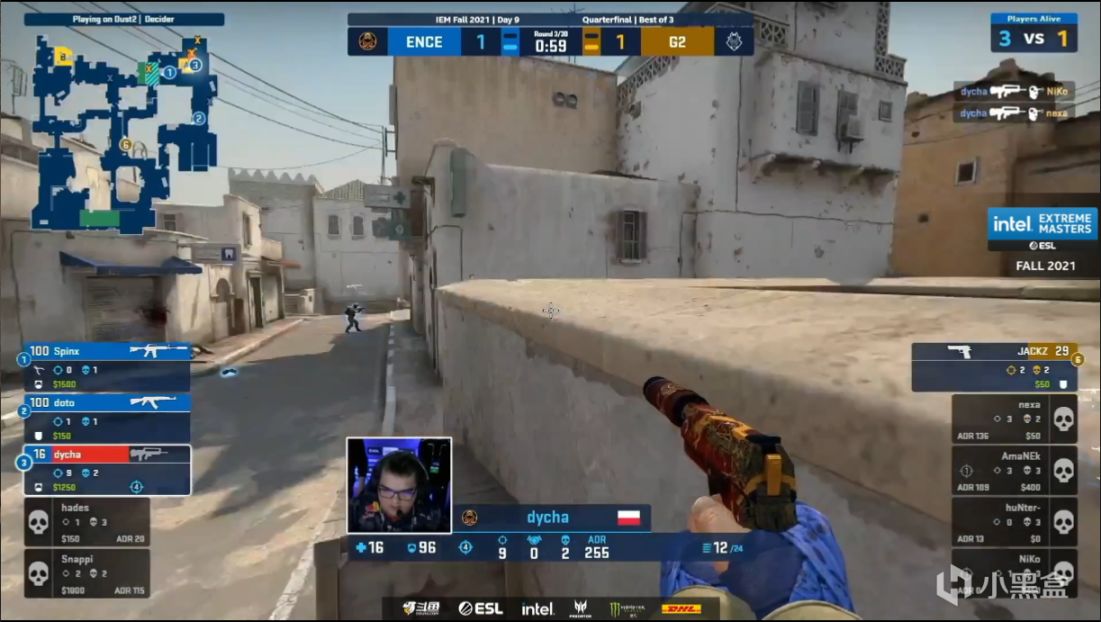 上半场手枪局g2先攻,ENCE三人顶中路一个没换,A小hades也只拿到一换一但是dycha拿到双杀,回到A小的dycha又一枪秒杀斜坡的jackz,可惜最后打残nexa后有些心急痛失1v4残局。强起局中路两队一换一,第二时间想进攻小道的g2被dycha警家回防打了两个,随后snappiA大鸟狙补回来也打出一个爆头,ENCE强起翻盘。第三回合Amanek中门先穿死一个,随后上小道Niko又秒杀了A大鸟狙,但是警家补防的dycha又一次站了出来,枪械劣势的g2众人没人架得住他被他推土机般回防四杀稳住局势,ENCE再赢一个eco,1-3。