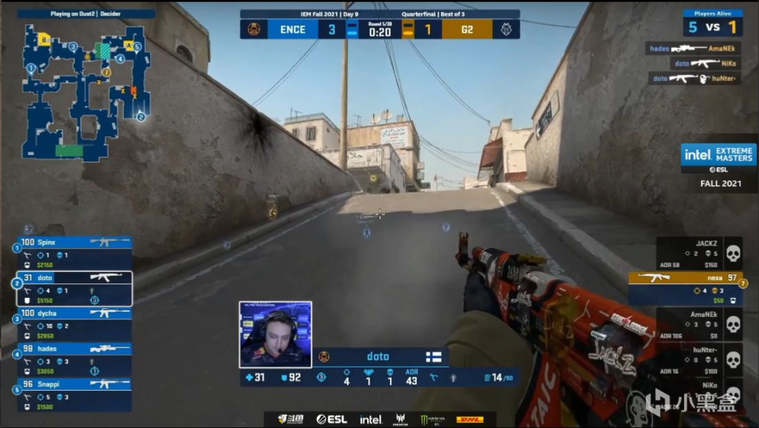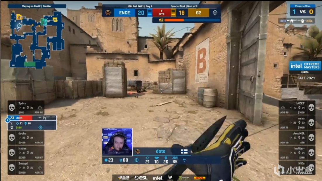 第二个加时上半场ENCE又是双人顶B1,虽然Niko被秒但是hunter帮他补回两个人头,但是第二时间g2的B点进攻还是被包点hades狙掉两个,B外的spinx又隔着烟补回一个人头,最终1v1残局dycha选择静步摸烟抓到Amanek换位置的timing帮队伍拔得头筹。下一回合g2想夹A被snappi全白打死一个打残一个,A小也被架住,只剩Amanek尽力打死两个也无法做到更多了。上半场最后一分g2全员出中门转B,人头交换后来到doto的一打二残局,找到警家jackz位置的他丢火没烧出只能大拉找jackz,这个时候狗洞拉出来的Niko犯了严重失误没有补掉这个侧身,doto进入B包点后也打赢了和Niko的头皮位对射,18-21。