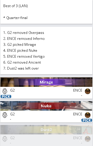 地图BP:(G2选择Mirage,ENCE选择Nuke,图三Dust2)