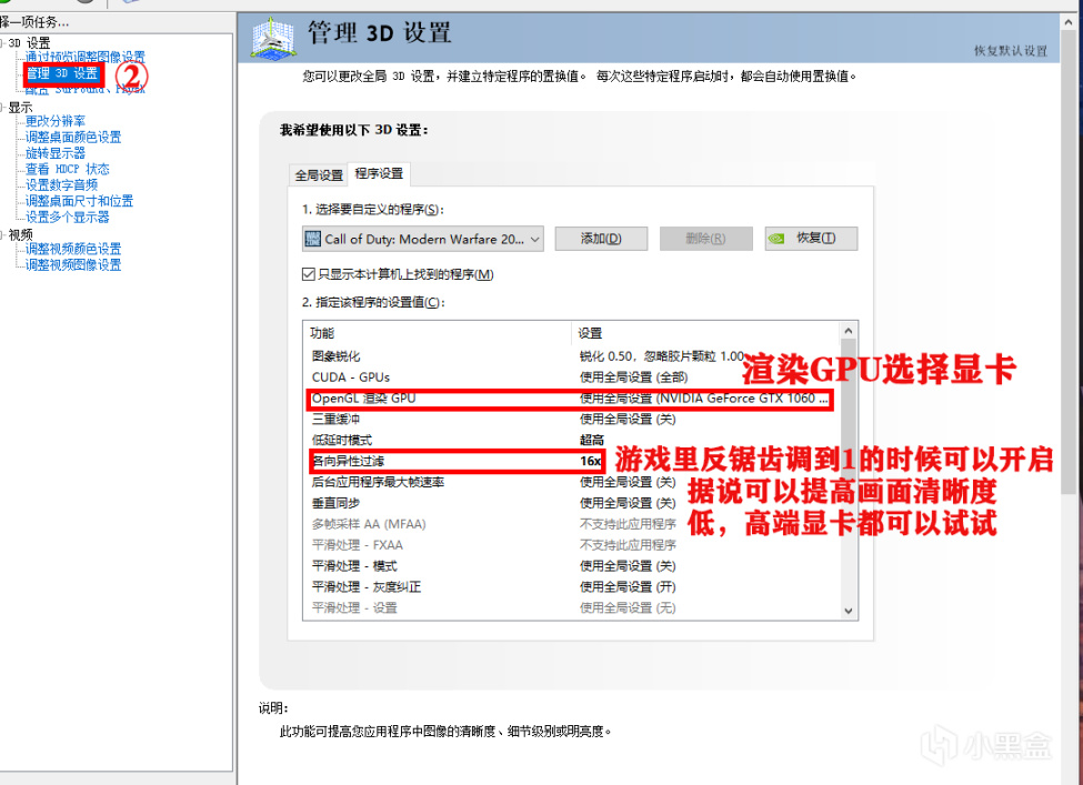2.程序设置里渲染GPU选择显卡和电源最高性能优先,其他默认。游戏里反锯齿是1可开启各向异性过滤,高端显卡不开DLSS反锯齿开1时也可以开到16X,高端显卡玩家可以试试这样设置画面清晰还是反锯齿开到最高清晰。这个不强制,以我1060显卡游戏里反锯齿1这里16X并没有影响游戏帧数,游戏画面看远处似乎清晰了。有待大家测试。