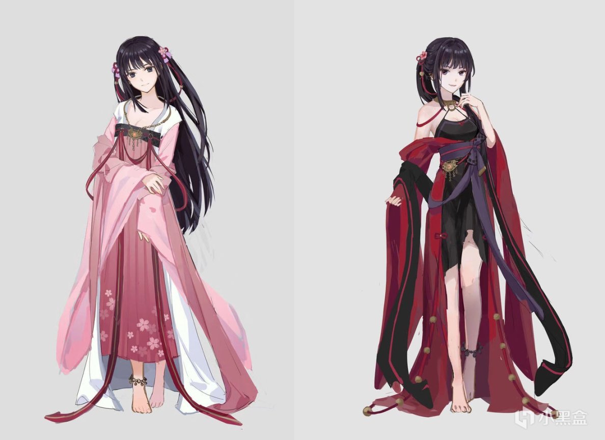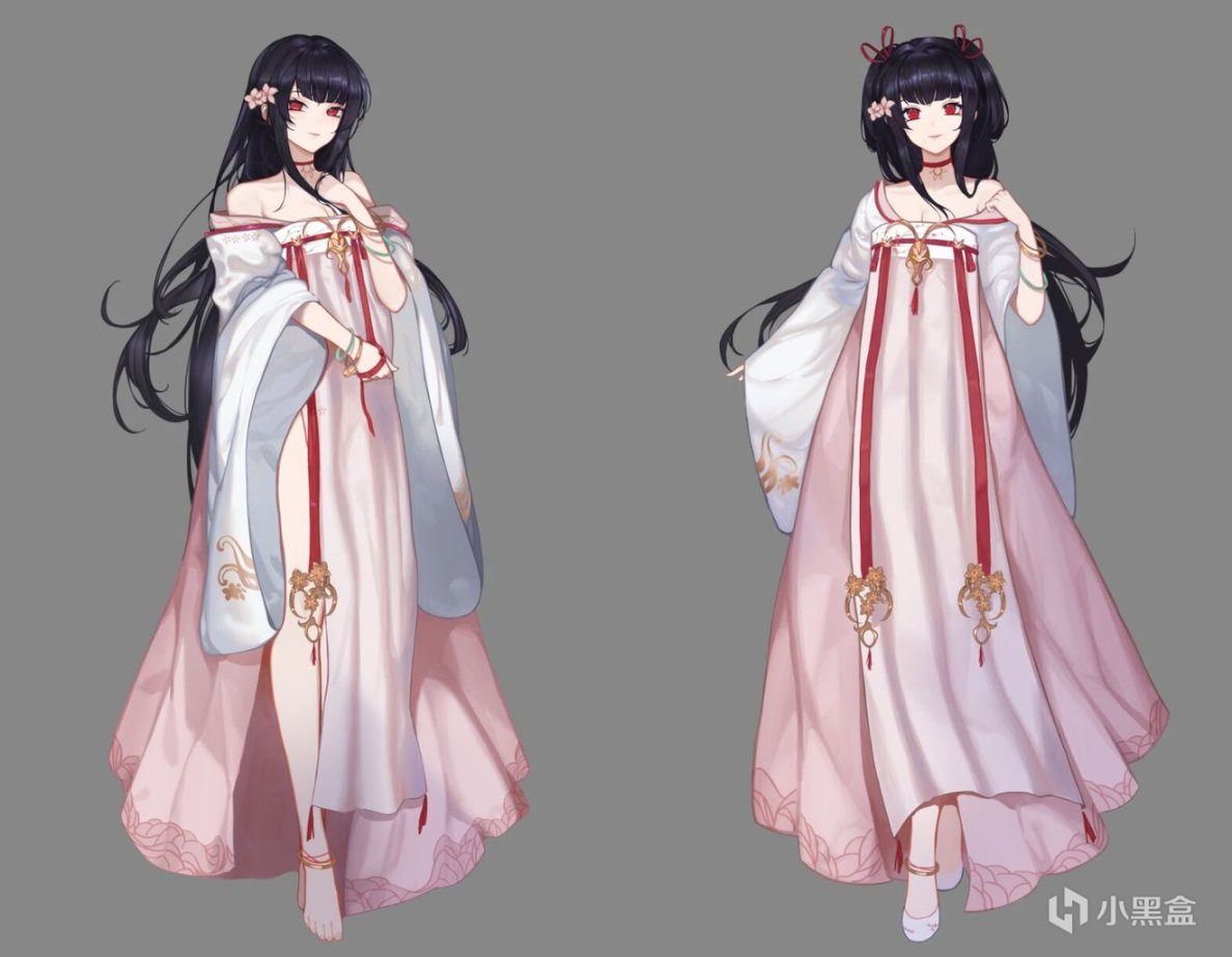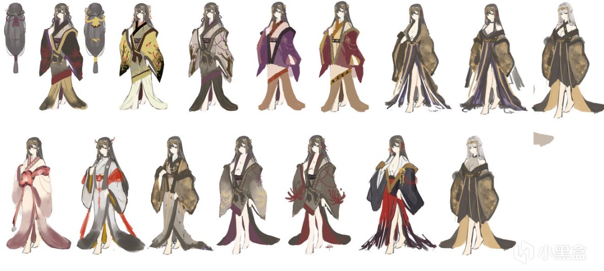 我们还尝试了许多服饰的配色搭配,不过最终还是选择了能较为清晰地体现出桃花和曼珠沙华元素的两款设计。