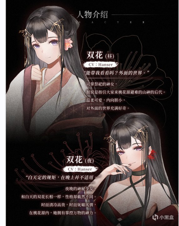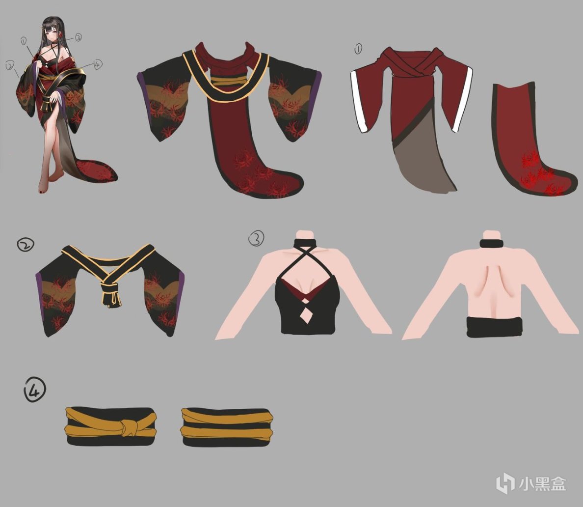 双花(夜)的服饰包含了一些曼珠沙华的元素,主要是想表达一种“死”或“永恒”的概念。