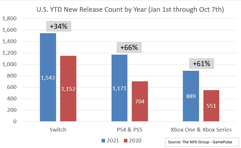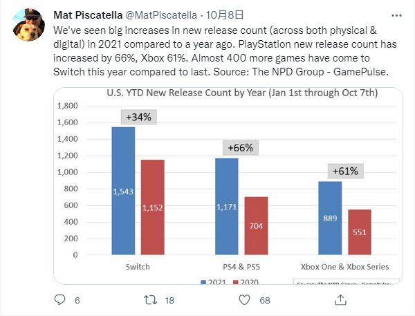 过去的18个月内,任天堂、Xbox、PlayStation旗下的游戏机以及游戏的销量非常可观,有人认为,这可能与2021年Switch、PS5、PS4、Xbox one和Xbox Series X/S上的新游戏发行数量猛增有关。